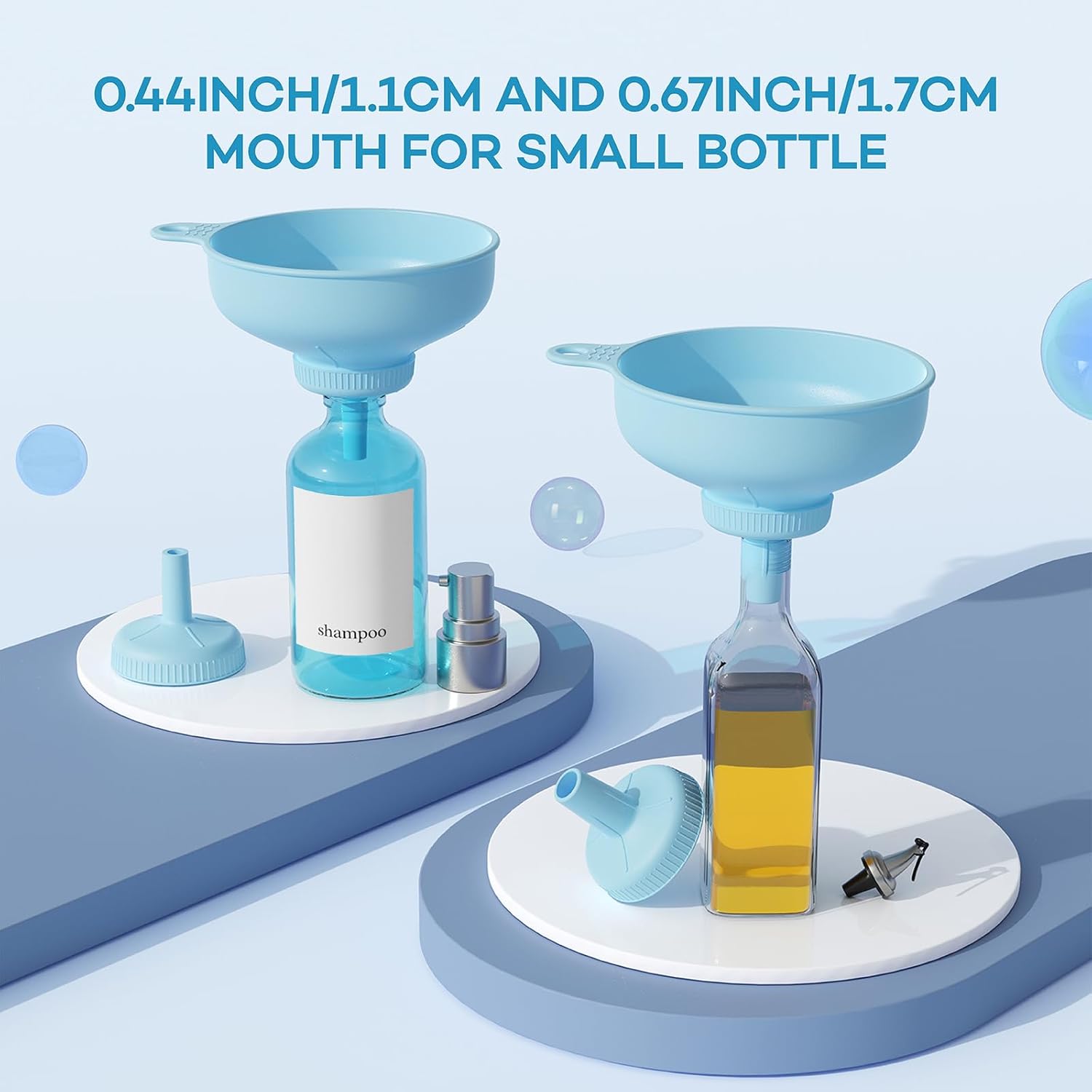 - Detachable and Rotating Screw Design: Just rotating the spout you can get a different mouth funnel(1.1 cm, 1.7 cm, 2.36 cm, 3.35 cm, 5 cm), allowing you to fill any food, cosmetic or particles into different sizes bottles