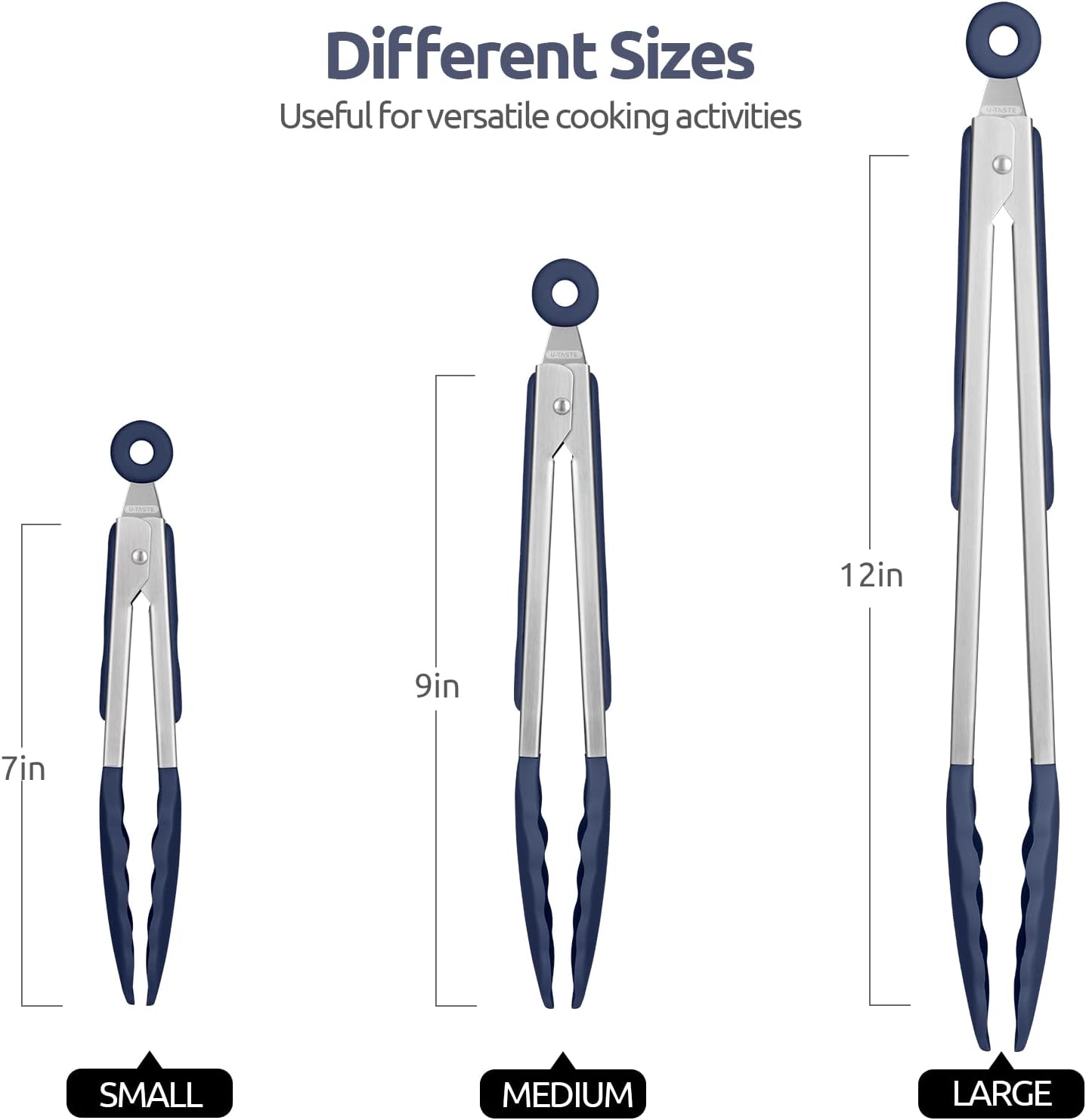 600ºF Heat Resistant Kitchen Tongs: U-Taste 7/9/12 inch Silicone Cooking Tong Set with Non Stick Rubber Tips and Silicon Coated 18/8 Stainless Steel Handle for Serving Grilling Salad(Midnight Blue)