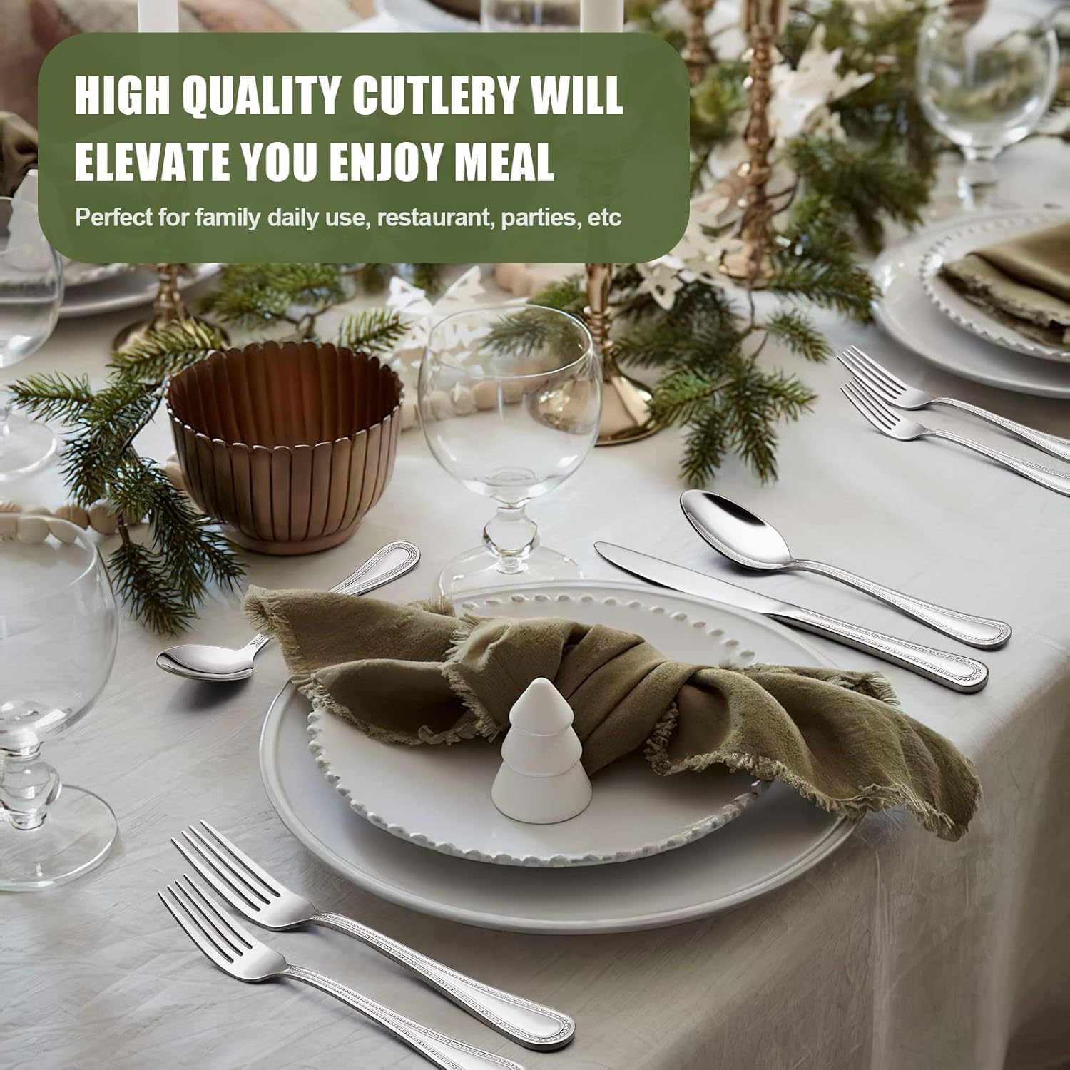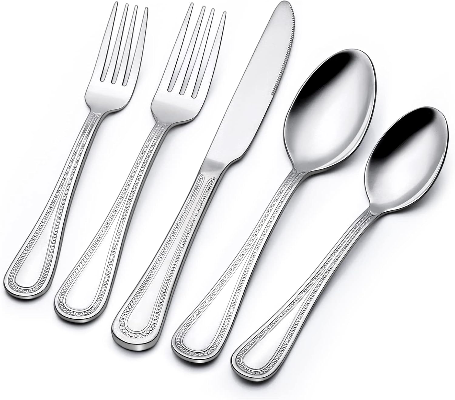 - ăADD ELEGANCE TO TABLEăThis cutlery set is a nice compromise between modern and classic thanks to its sleek, simple beaded design and bright mirror finish. Whether your style is traditional or modern,this flatware will complement your decor and never look dated. The elegant utensil set is perfect for family daily use, parties, family dinner, wedding, hotel, restaurant, formal dinner, etc.