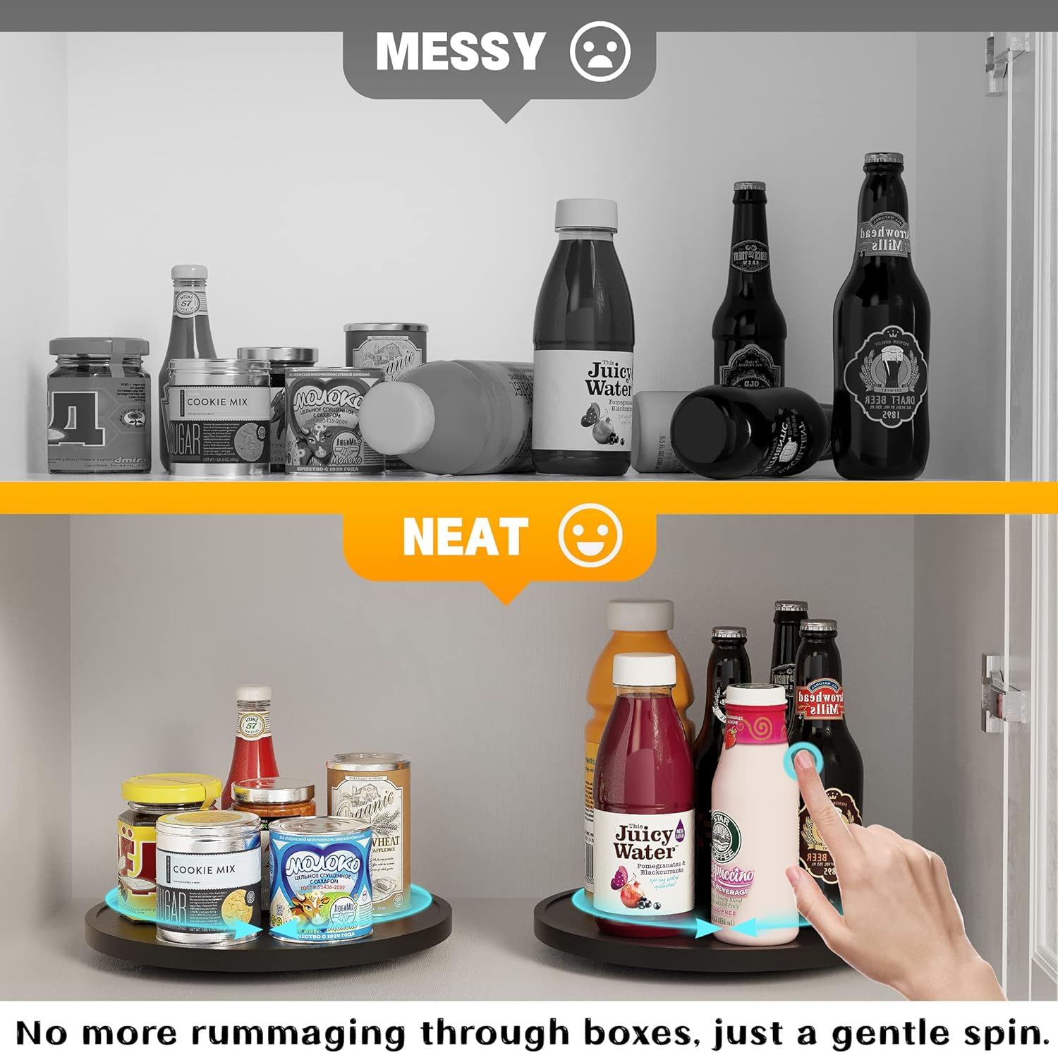 - ✔️【EASY TO REACH FROM ANY SIDE】This Lazy susan is 360-Degree turntable, which makes it ideal for cabinets or counters. Especially in corner cabinets and deep base cabinets where items can be hard to reach, always convenient to get things from upper shelves or corner cabinet just by a simple spin!