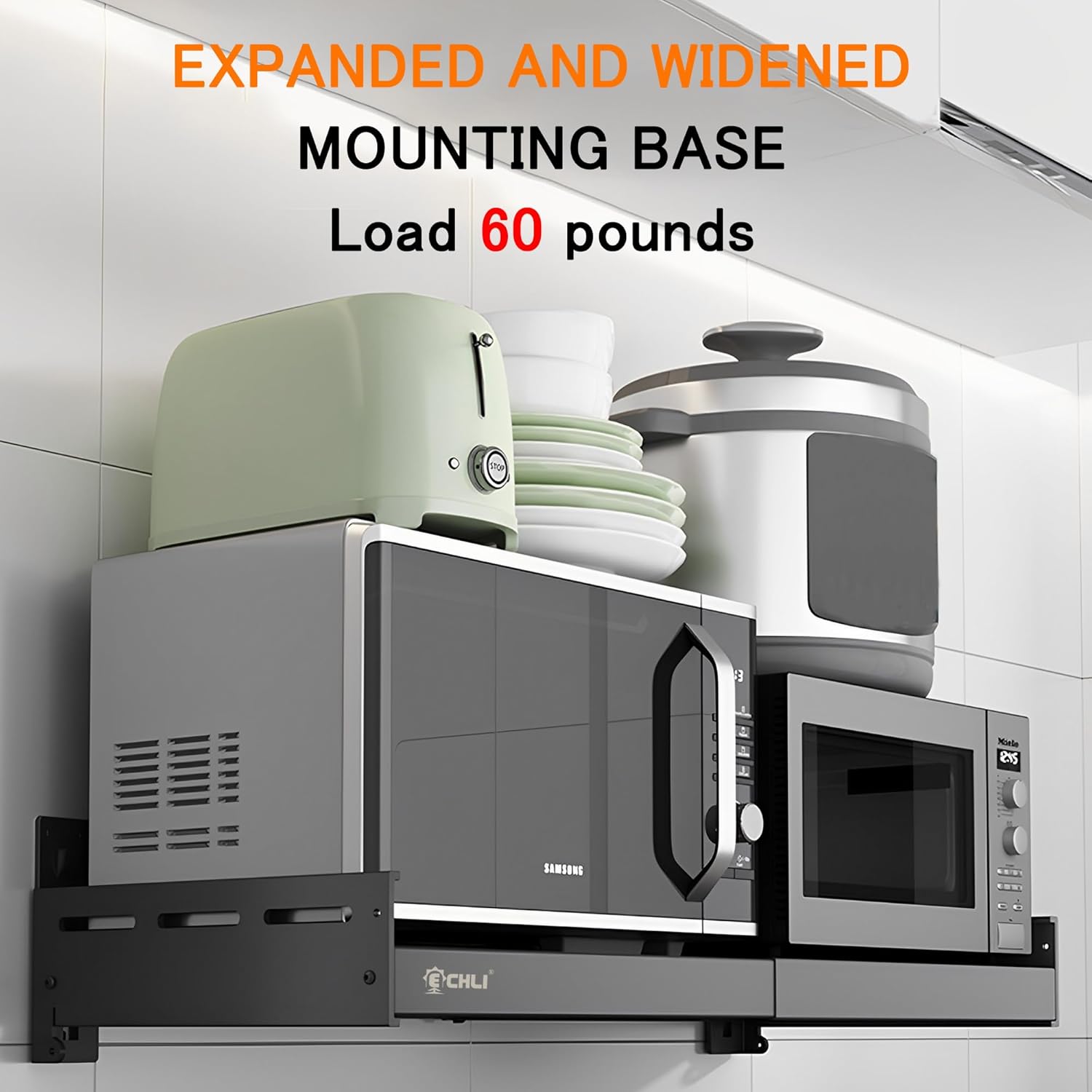 - Retractable and adjustable --- Place your microwave or electric oven on this wall-mounted stand, the length of which can be extended and mounted to suit your needs. You don't have to worry about the shelf being too long or too short. (Shelf: 16 inches wide, 16 inches before stretching, with a maximum load-bearing distance of 25.5 inches. Please do not exceed, as bending is prone to occur !!!!)