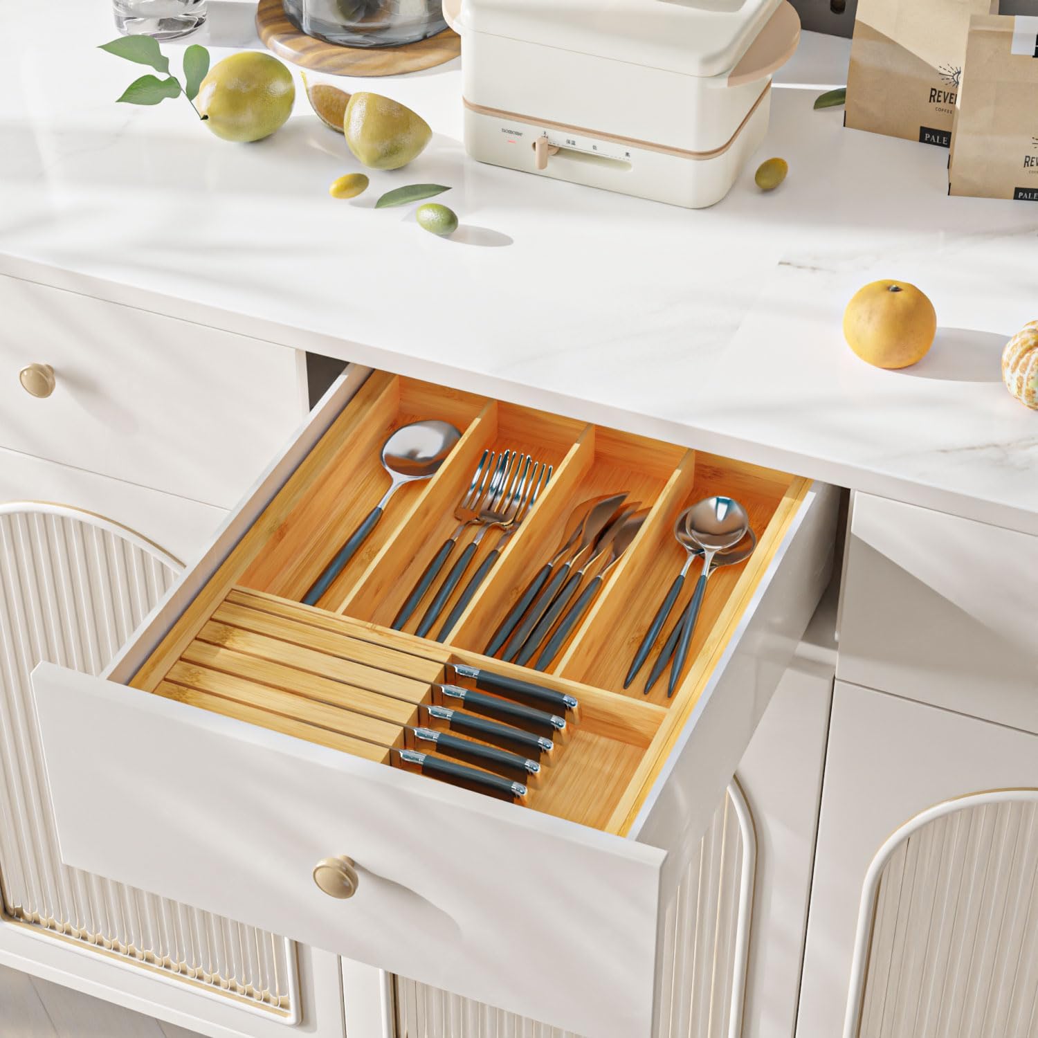 - ă100% High-Quality Bamboo Materială: The silverware drawer organizer has a smooth surface, strong and firm seams, and is easy to clean.