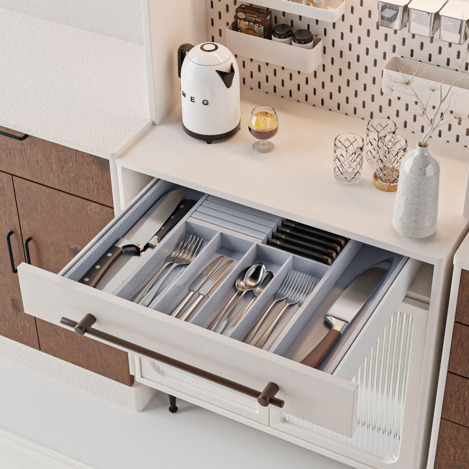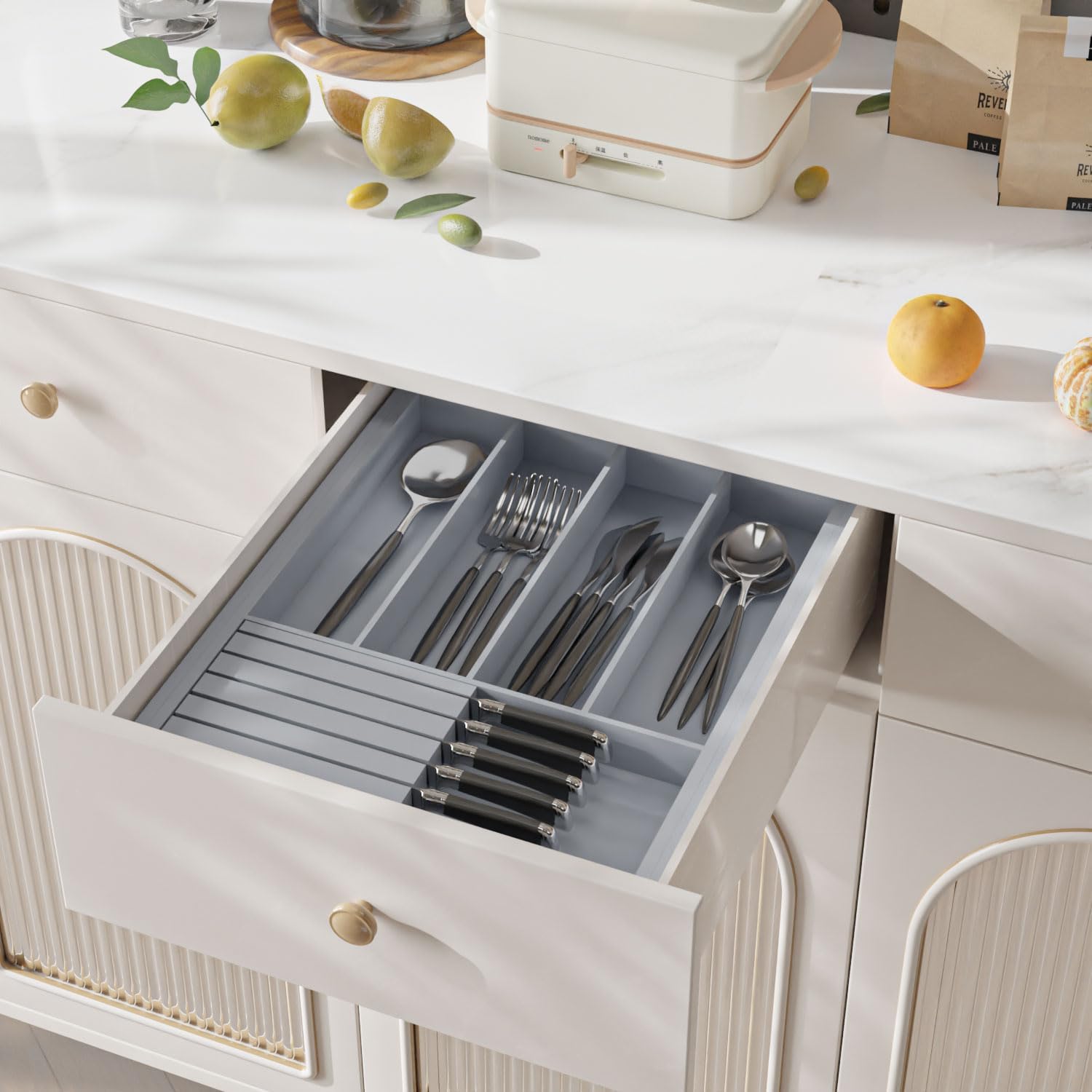 - ă3-in-1 Organizeră: Kitchen Drawer organizer with steak knife holder, no assembly required. It can store kitchen utensils, knives and silverware together, which can effectively complete the kitchen organization work and keep your tableware in order, beautiful and tidy.