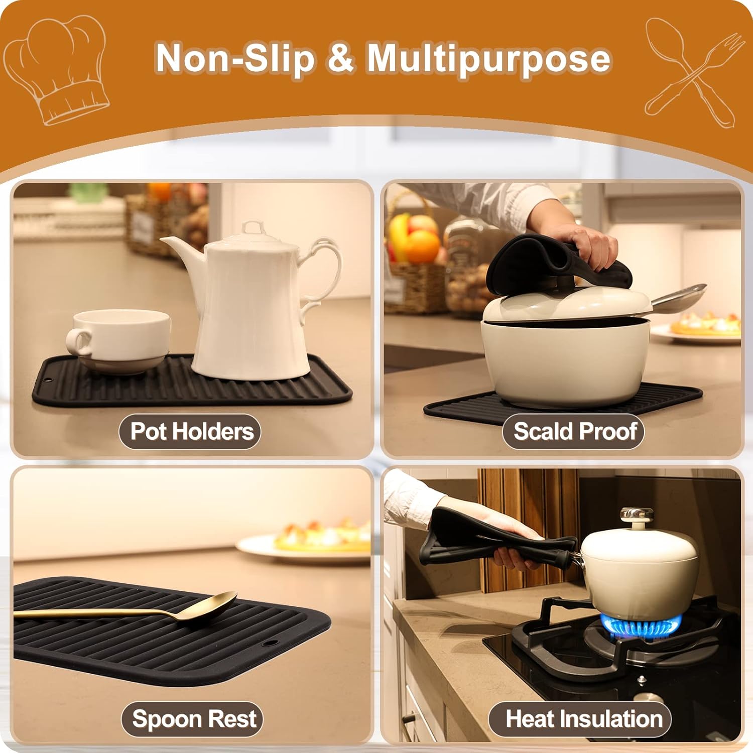 - MULTIPURPOSE KITCHEN TOOLS - Our silicone trivets for hot dishes are non-slip, flexible and soft enough to comfortably grab hot pots and pans, jar opener, drying mat or potholders. Silicone hot pads for kitchen are perfect for use in an oven, microwave, or freezer, protect your hands from hot and cold.