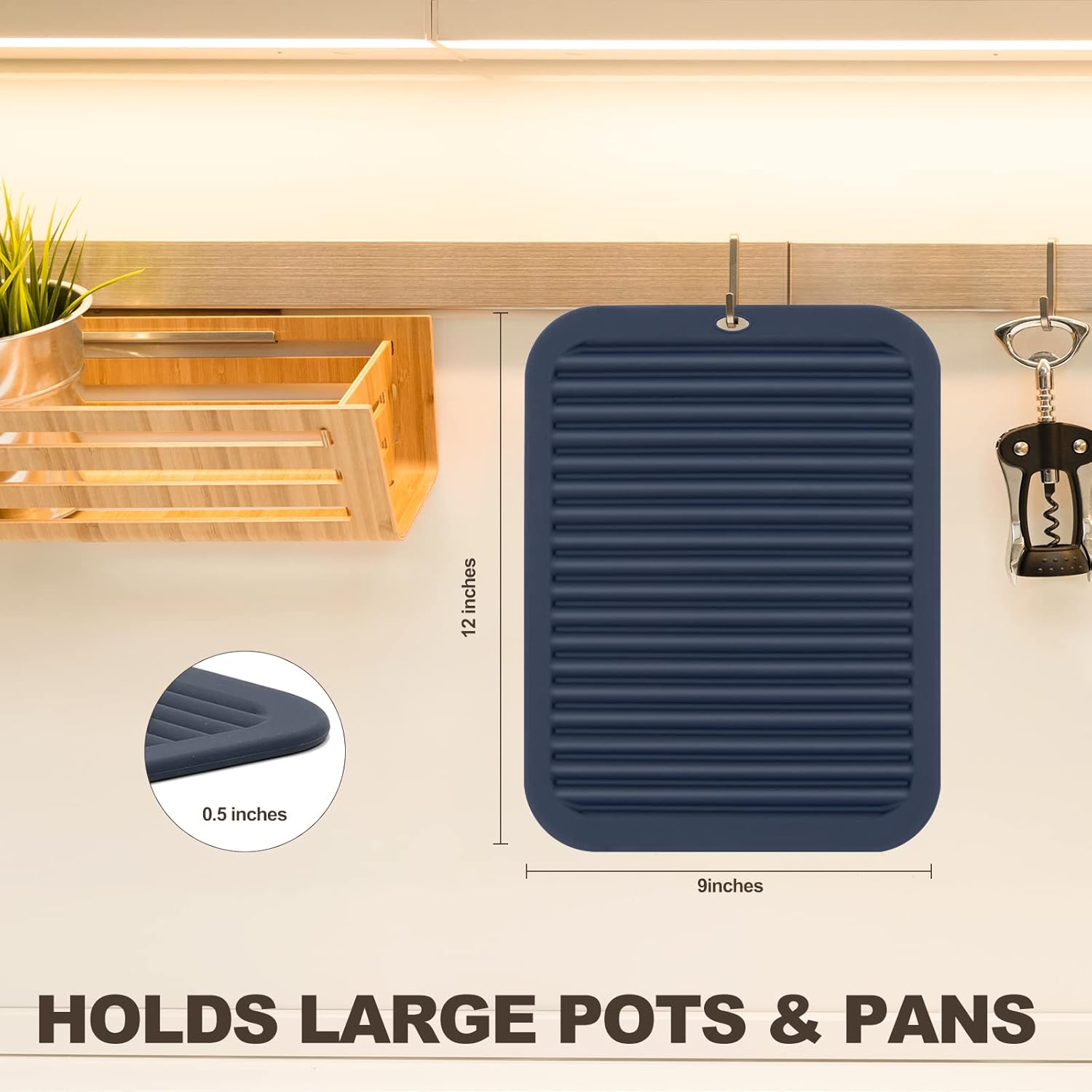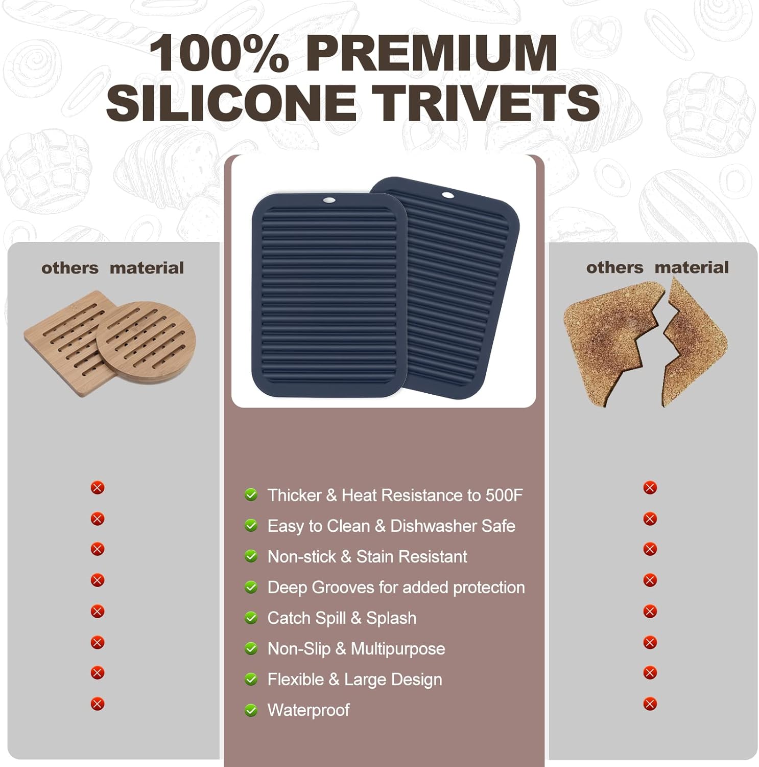 - HEAT RESISTANCE UP TO 480F - Large silicone trivets for quartz countertops are made of premium silicone, it can withstand cold and hot temperatures from -40 to 480F, Raised wide ridges will separates the hot pot from the table, protect your kitchen surfaces from scalding.