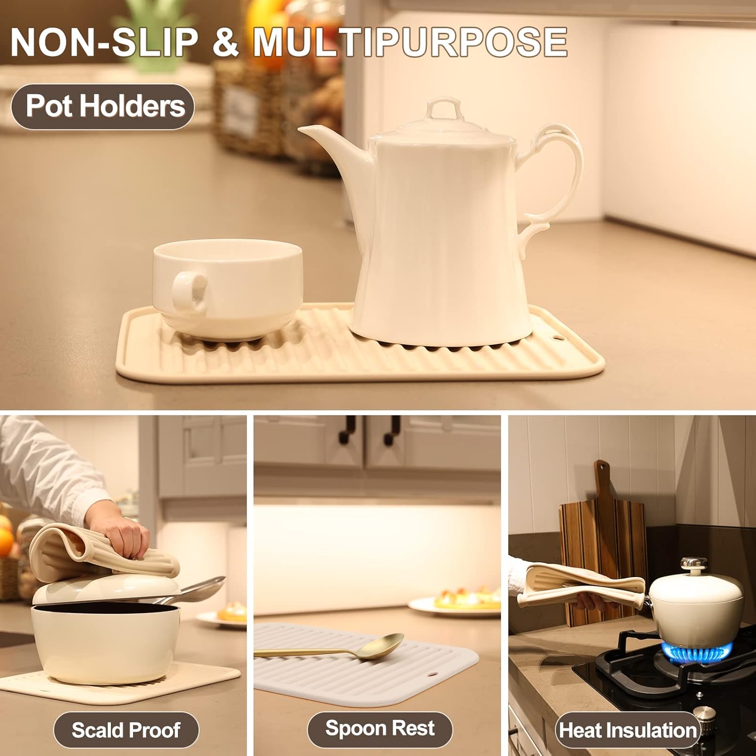 Joyhalo Trivets for Hot Dishes - Hot Pads for Kitchen, Silicone Trivets for Hot Pots and Pans, Hot Plates to Protect Table, Quartz Countertops Heat Resistance to 480°F, Set of 2, Khaki