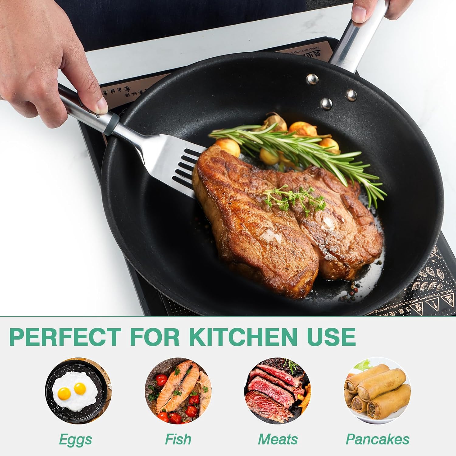 - 【Multi-Function for Kitchen Use】The turner spatula is suitable for most applications in kitchen and outdoor grill, such as frying fish or steak, flipping pancakes, grilling burgers, cooking scrambled eggs or omelette, etc.