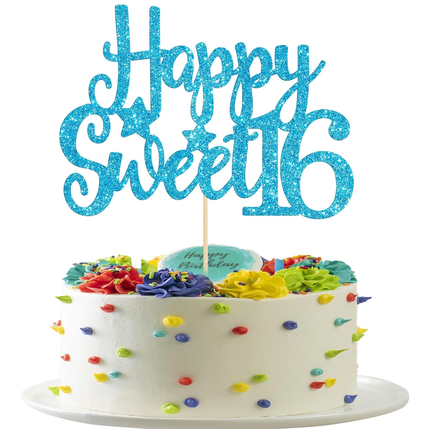 Gyufise 1Pc Happy Sweet 16 Cake Topper Glitter 16th Birthday Cake Pick for Cheers to 16 Years Old 16th Birthday Party Cake Decorations Supplies Light Blue