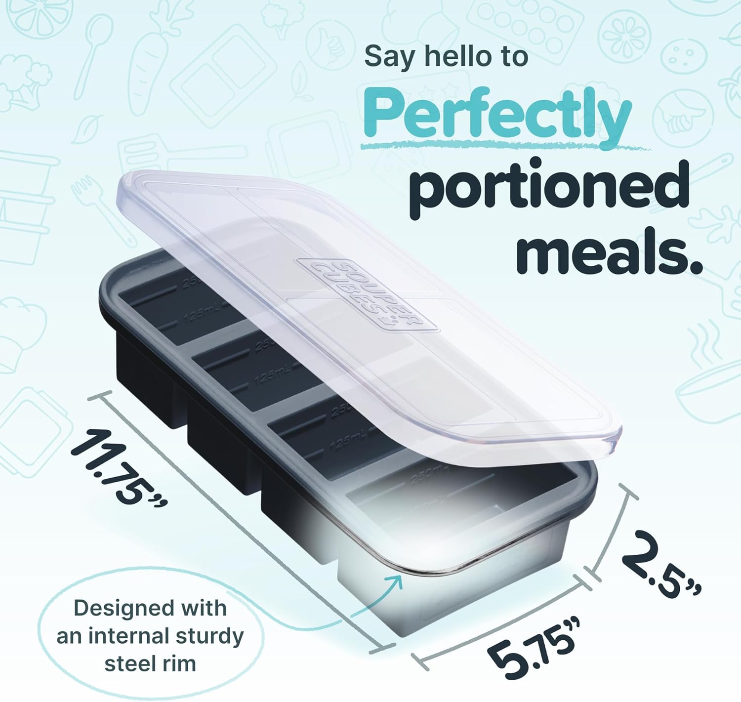 - SAVE TIME AND MONEY BY MEAL PREPPING: Spend less time thinking about what you're going to eat and more time enjoying it. Our silicone freezer trays with lid is designed to make meal prep a breeze. The tray is made from food-safe silicone with a steel-reinforced top and a convenient lid.