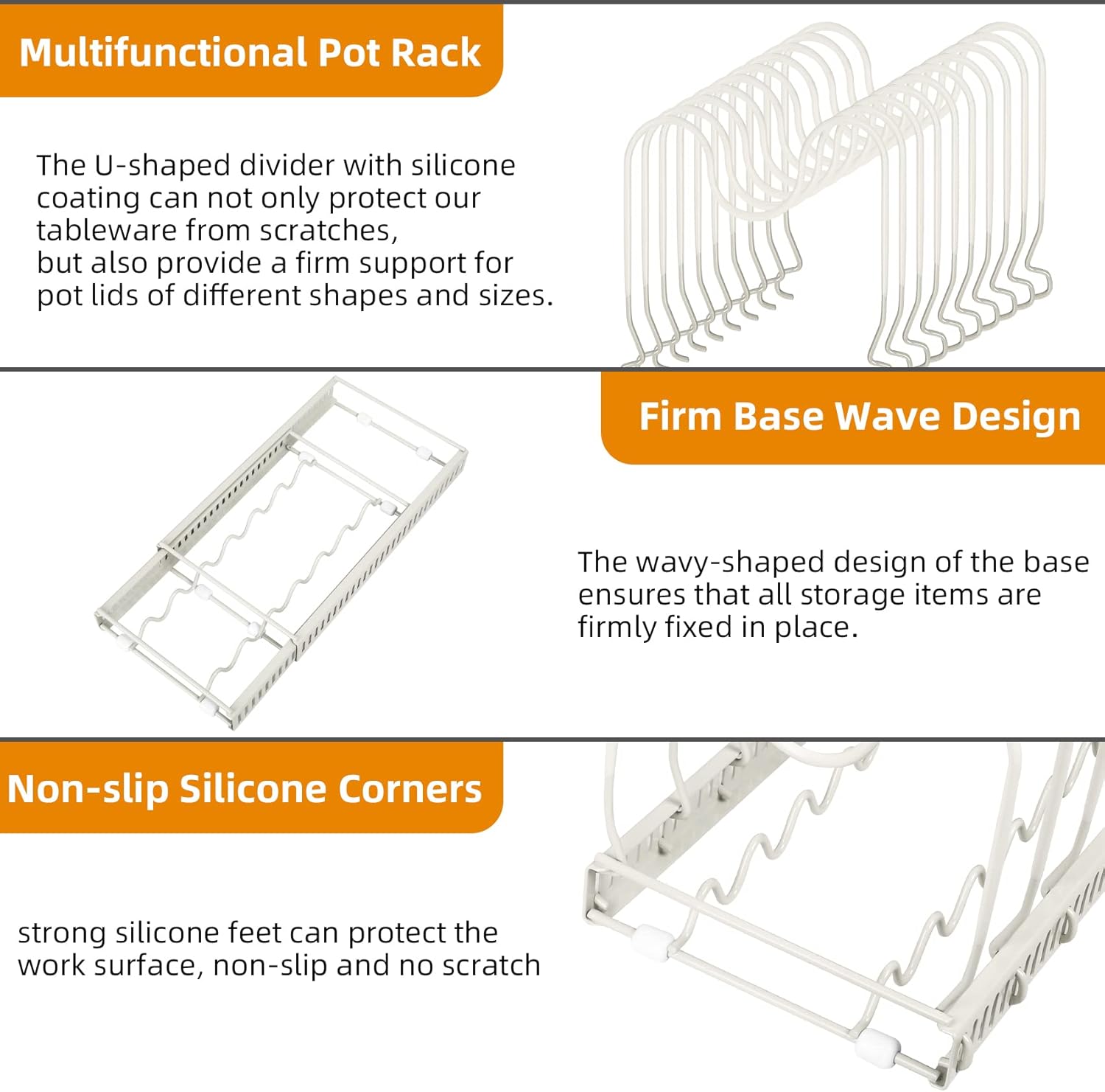 - Upgrade 10 Adjustable Compartments - In order to satisfy you for storing more pots and pans or lids, we have designed an upgraded pot organizer with non-slip silicone dipping 10 divider, can store up to 9 pans or griddle baking pans, etc. This is a perfect solution to store all your POTS and pans, saving you a lot of space in the kitchen or on cabinets and countertops. Create a clean and tidy kitchen for you.