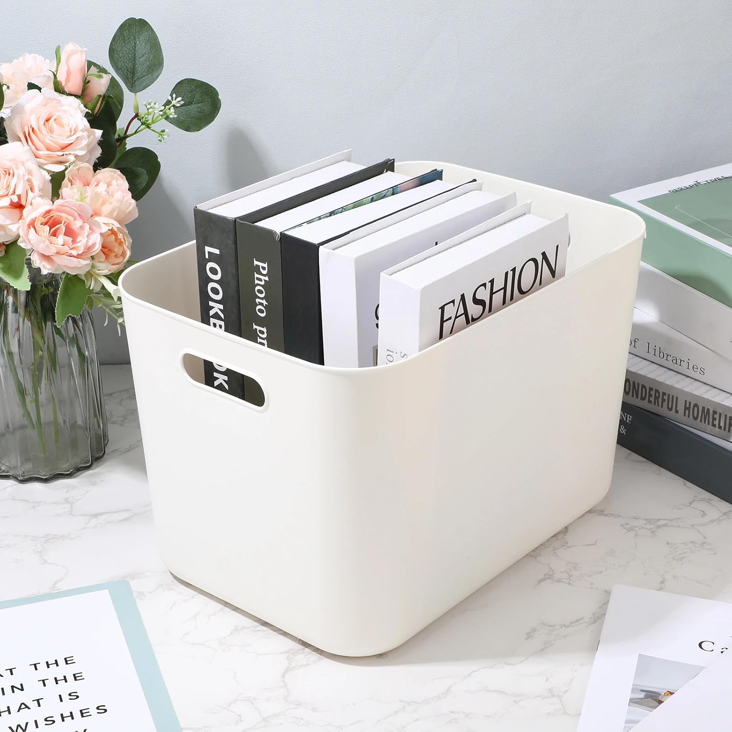 - Multipurpose Storage Bin Set: you will receive 10 pieces of white plastic storage bins with handles, the ample quantity can certainly meet your daily storage requirements and classification needs, which can hold a lot of things, maximizing your space and making your home tidier and cleaner