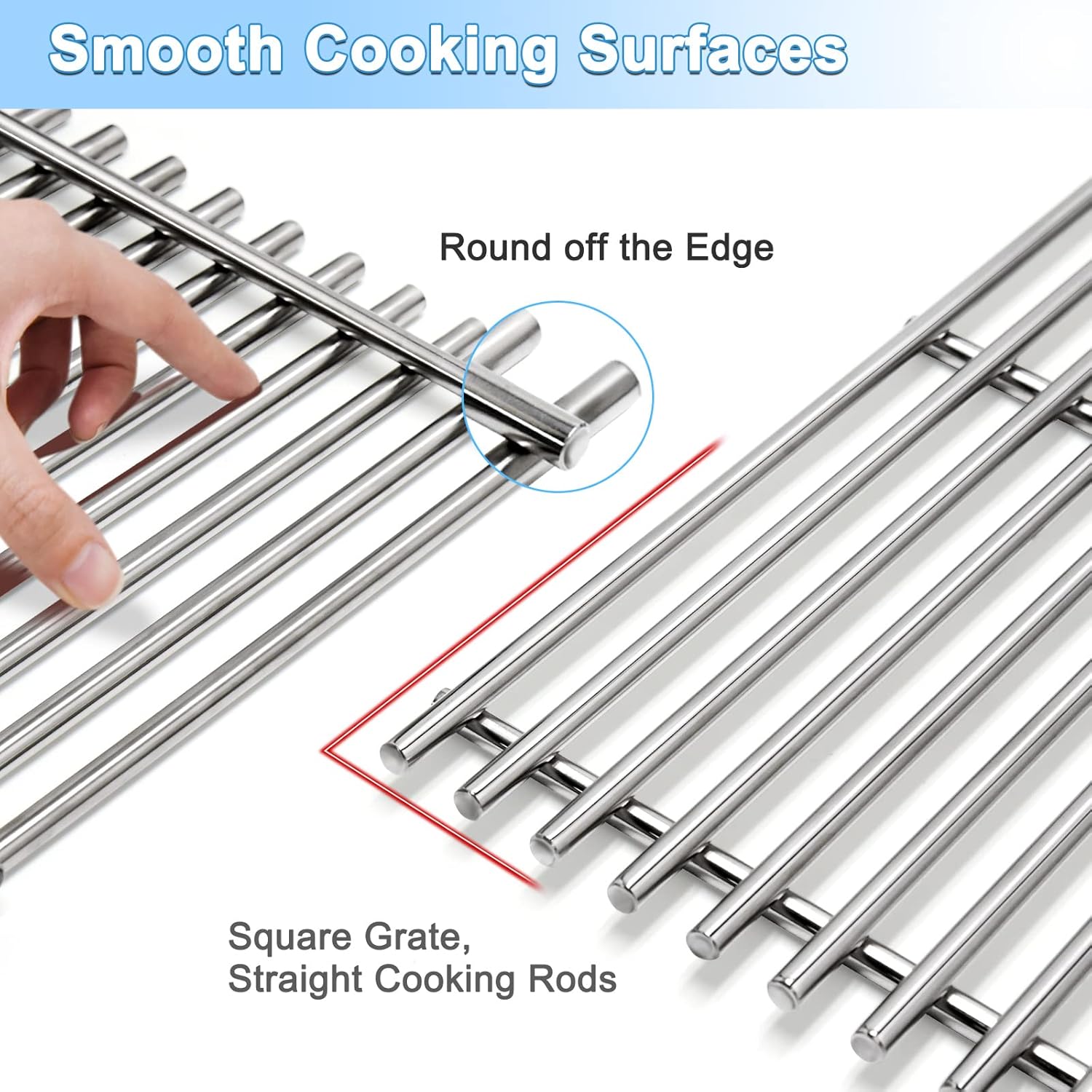 - Smooth Surface Straight Rods: Made of 7MM solid stainless; Our grates are Square, so they are very suitable for weber; Narrow gaps between each rod allows you to cook small food without worrying food-falling; During the cutting process of the weber grate, the steel edge is cut very smoothly. It will not scratch your hands and give you a safe and healthy barbecue experience.