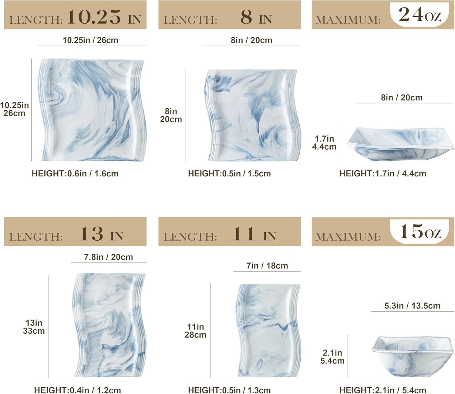 - Stylish and Low Maintenance -- Featured with low-profile wavy-shaped square design, each plates and bowls set are distinct and add an sophisticated touch to any table setting; The blue dinnerware set are designed to provide the best dining experience while requesting low maintenance, saves you time and effort in upkeep