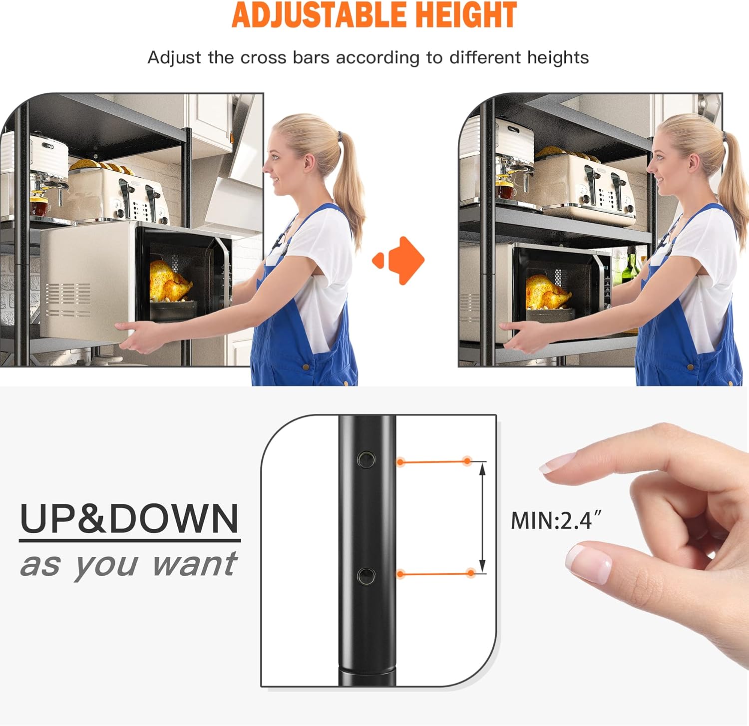 - ăMulti-functional Shelves for StorageăThis heavy duty shelving units and storage can be used in living room, kitchen closet, office, bathroom, pantry, etc. The black shelf can hold a lot weight and looks nice and clean, which is suitable for storing kitchen appliances, bathroom appliances, books, boxes, tools and toys