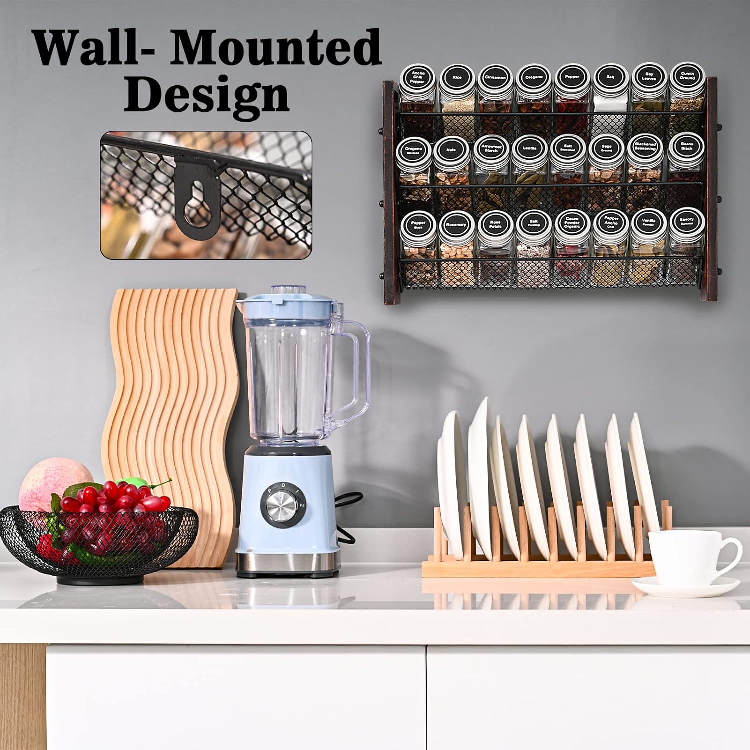 - Rustic Spice Rack Organizer Set: 1 set of rustic spice organizer, 24 empty glass spice jars, 180 spice labels (including 125 pre printed labels and 55 blank labels), 1 white chalk mark, and 1 funnel. It can meet all your needs for spice storage