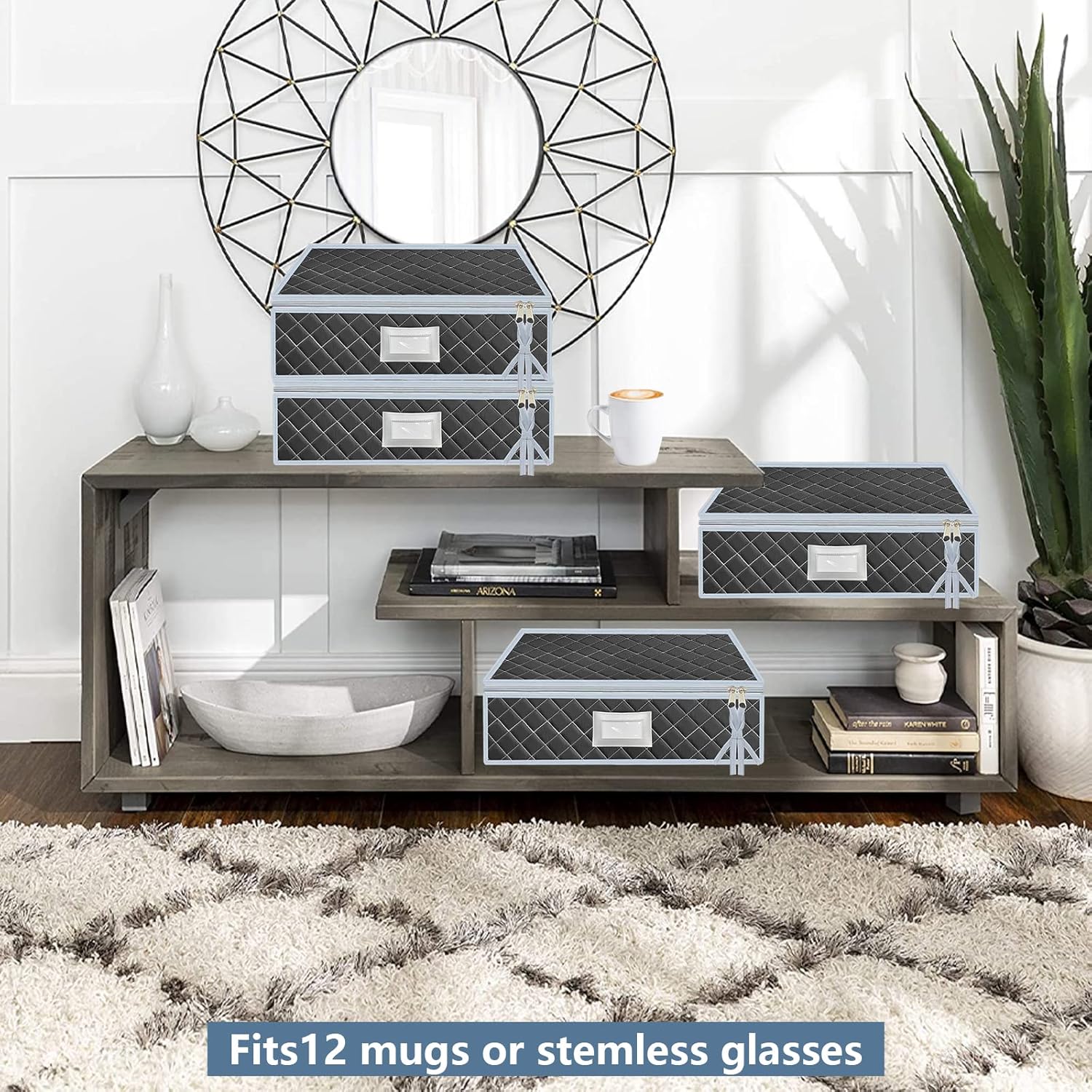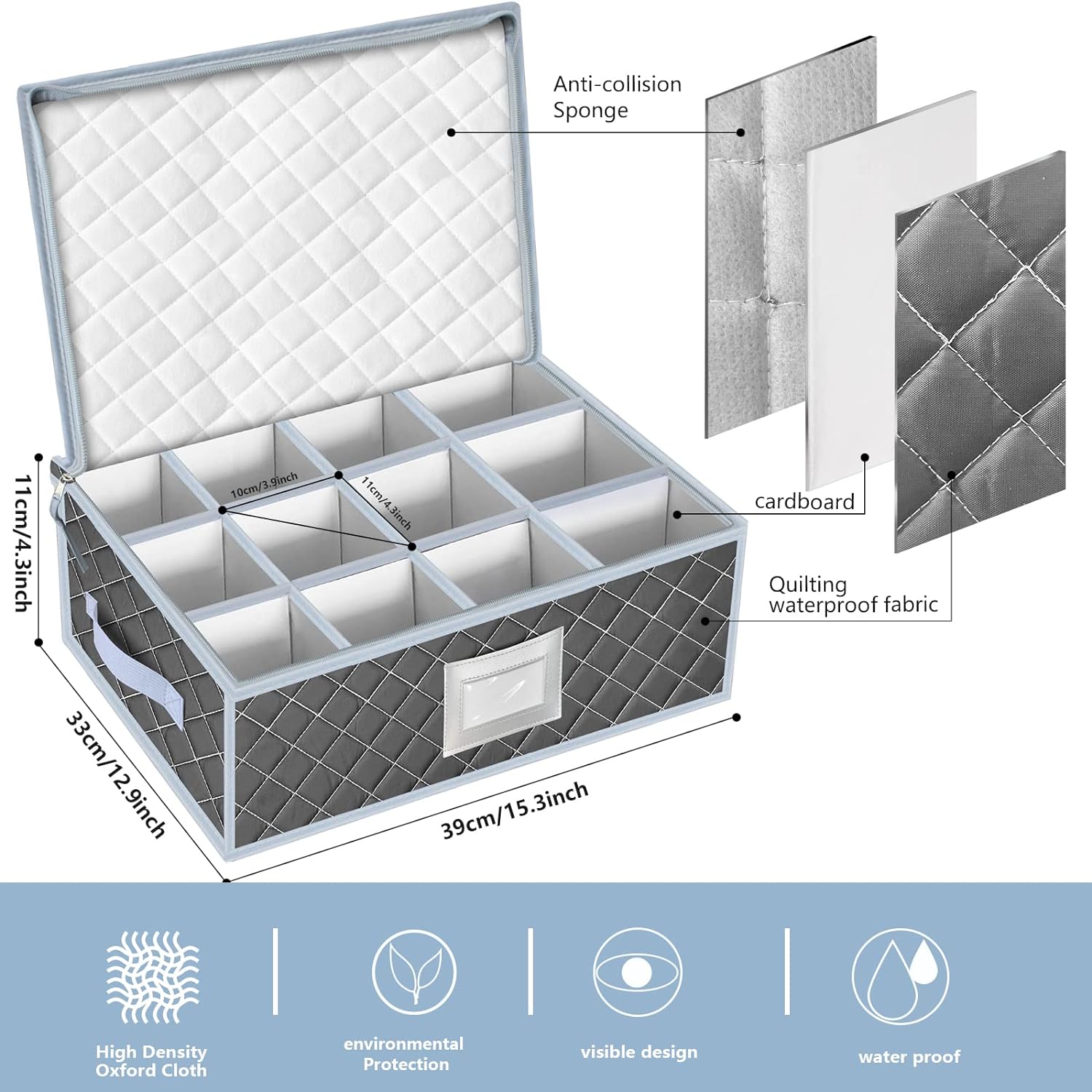 VERONLY Mug and Cup Storage Box with Dividers - 2 Pack China Storage Bin Containers Holds 24 Glassware, Stackable Coffee Mug Organizer Bin and Tea Cup with 2 Metal Zipper,Label and Handles (Grey)