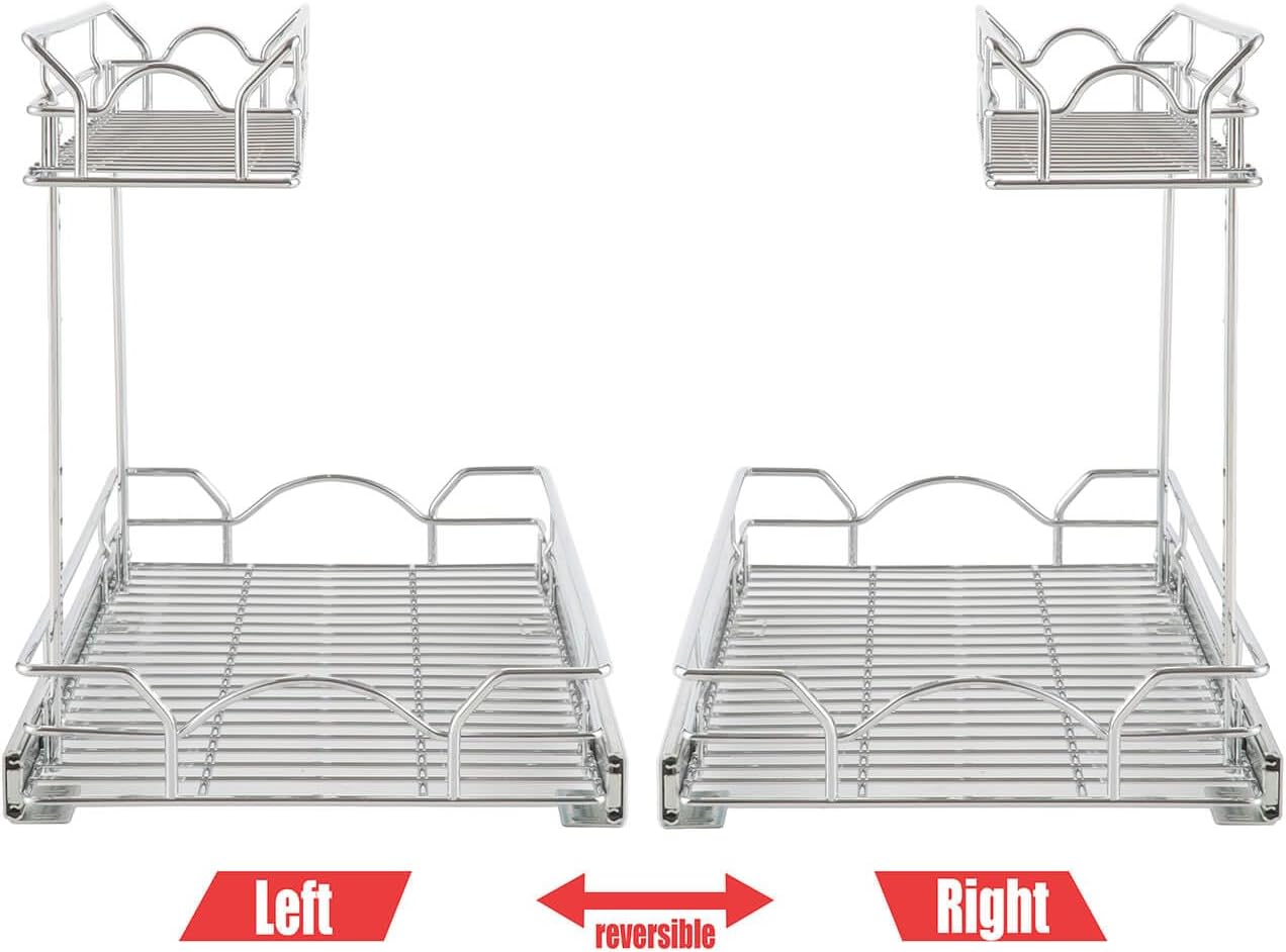 - REVERSIBLE DESIGN WORKS IN EITHER THE RIGHT OR LEFT SIDE of cabinets, at the same time, the under sink pull out shelf that makes room for pipes and garbage disposers are more suitable for making use of the space under the sink.