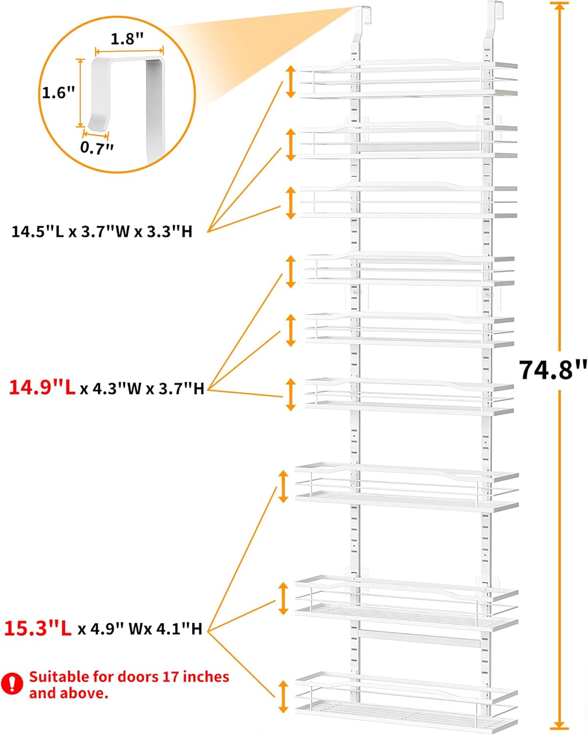 - You will get 3 large shelves (15.3"L x 4.9" x 4.1"H), 3 medium shelves (14.9"L x 4.3" x 3.7"H), 3 small shelves (14.5"L x 3.7"W x 3.3"H), including all necessary mounting hardware. The overall height after installation is 6.2ft, suitable for most doors. USPTO Patent Number:29884987. PLEASE NOTE: You may receive the wrong package showing "8-Tier", but the item inside is completely correct 9-tier.