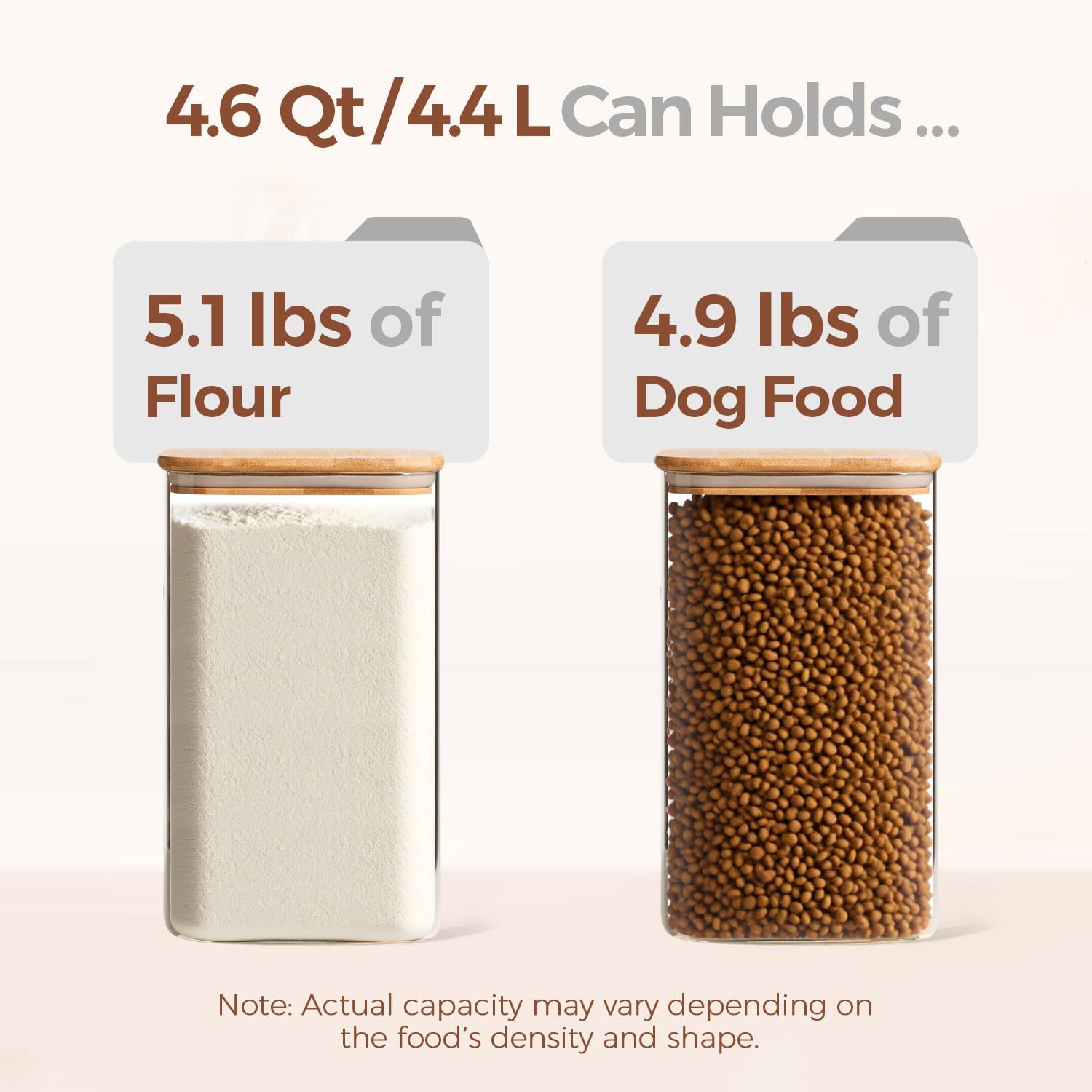 ComSaf 4.6Qt Glass Food Storage Containers, 1.2 Gallon Glass Flour and Sugar Containers with Airtight Lids, Large Square Jars with Bamboo Lids for Rice, Pasta, Oats, Grains, Cookies, Coffee Beans