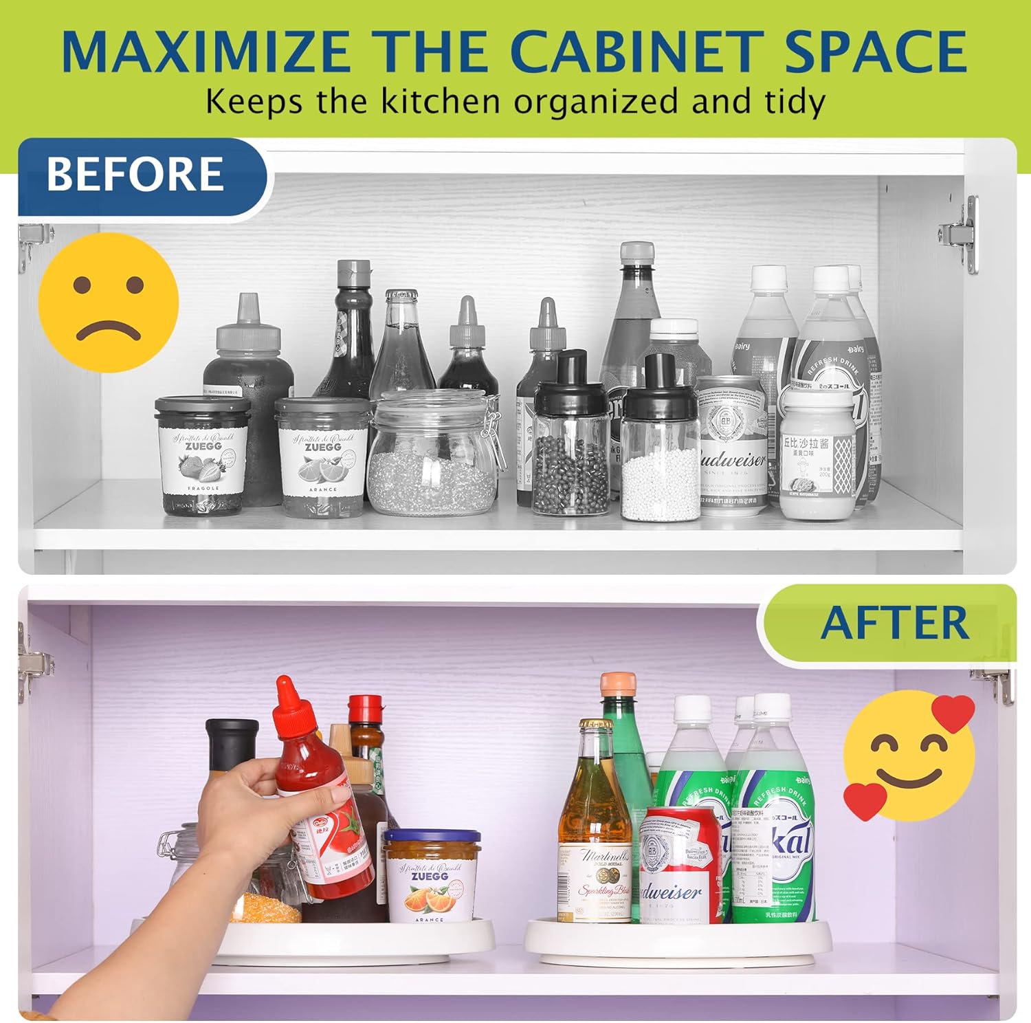 - Multifunctional Turntable Organizer: Perfect spinning storage organizer for kitchen, pantry storage, dining room, bathroom countertop, table, under the sink, refrigerator, cabinet closet,etc. You can organize such as spice jars, oil bottles, fruits, vegetables, drinks, snacks, toiletries, cosmetics, etc.