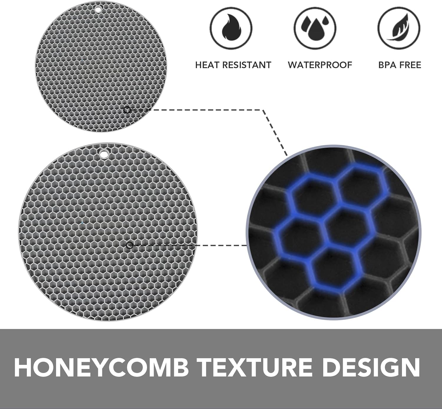 - HEAT RESISTANT & LIGHTWEIGHT - The trivet is temperature from -105F to 446F, protect your hands, pans, and countertops with our silicone trivets that includes 2 round and 2 square honeycomb silicone pot holders.