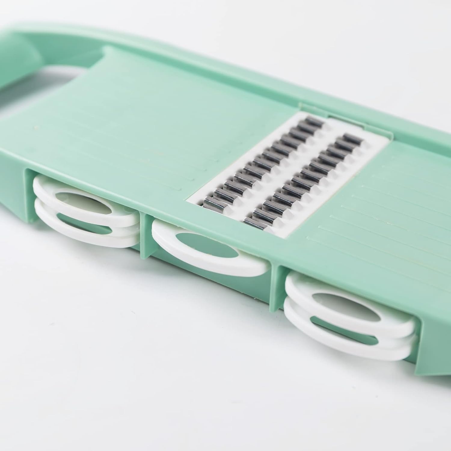 - ćMULTI BLADE ADJUSTABLEć - The mandoline slicer for kitchen package includes five adjustable blades for grating, slicingļ¼ shredding,chopping and grinding. It also comes with a peeler for easy peeling.Perfect for vegetable salad, potato chips, waffle fries, peeling.