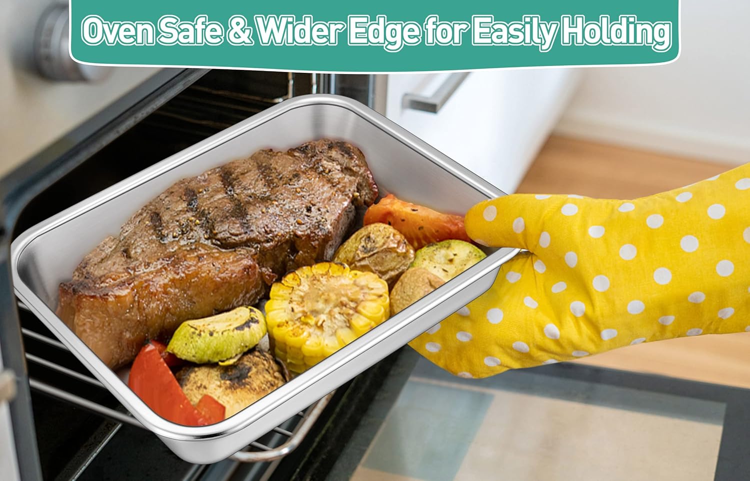 - DEEPER SIDE – 1.7inch deeper than traditional flat baking pan helps hold more food and prevents hot liquid from flowing out easily to keep your oven neat, Smooth and wider edge without any sharp spurs to prevent hurting and provide comfortable grip to take it in or out of the oven