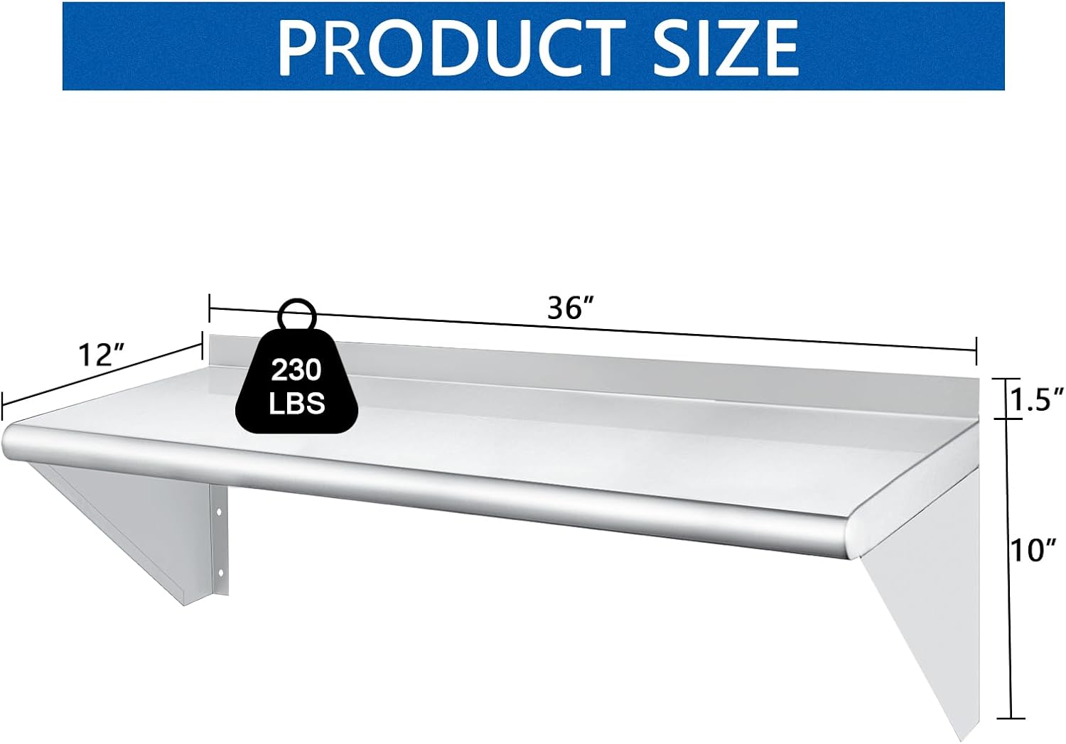 - ăSTURDY STRUCTUREă- The stainless steel floating shelf has a remarkable weight capacity of 230lbs, The size is 12 "W x 36" L. Two triangular brackets are designed below the shelf to enhance the stability and distribute weight evenly, it provides enough storage space for spices, kitchen appliances, microwave ovens, allowing you to place products at a glance.