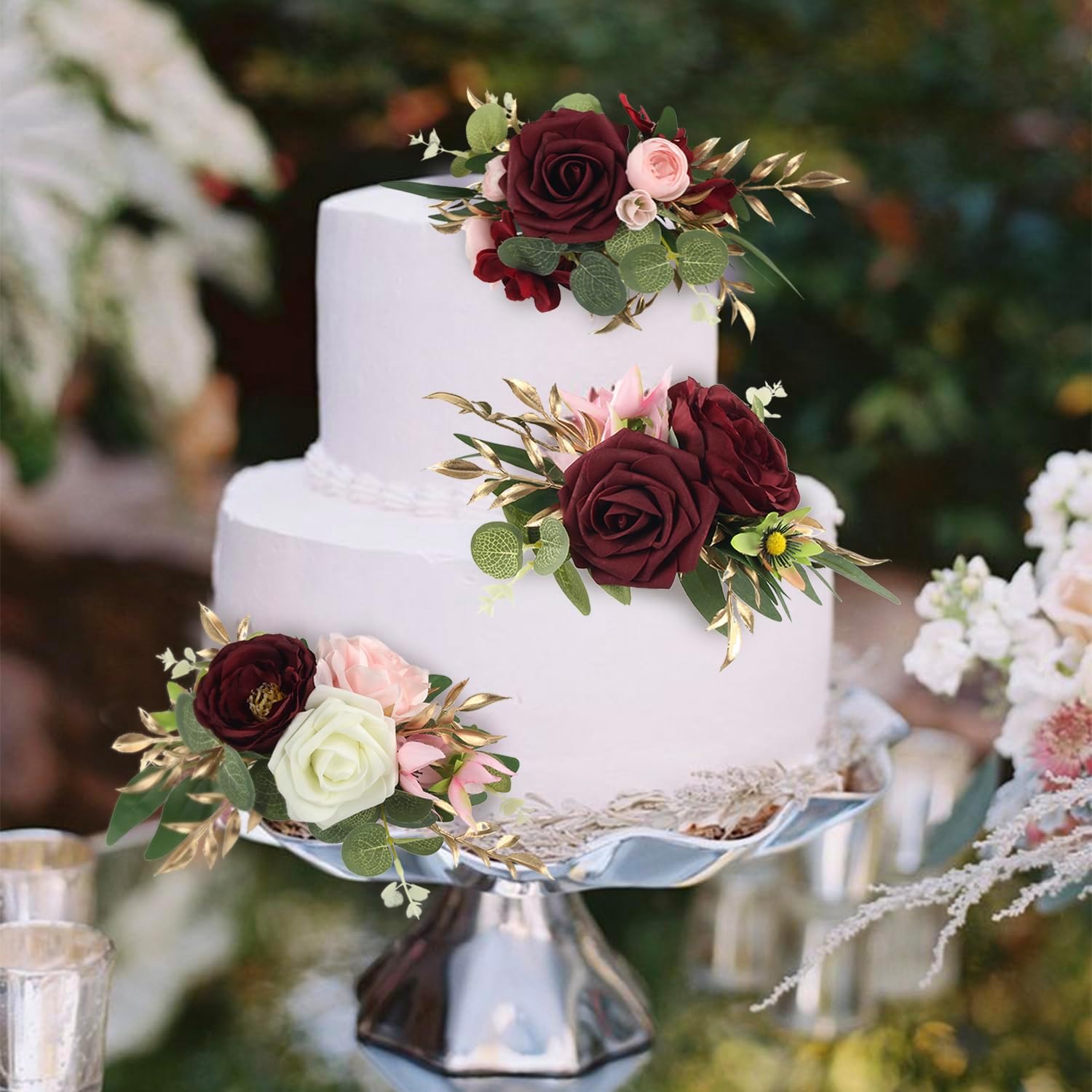 Rinlong Pre-made 3Pcs Cake Toppers Burgundy Flowers Cake Decorations Wedding Cake Decorating Flowers Decor Birthday Baby Shower Party Christening Christmas Cake Toppers