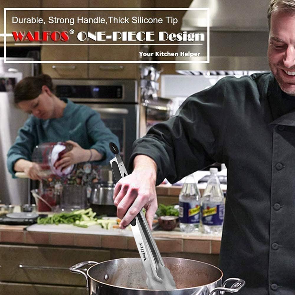 - ★FOOD GRADE AND STURDY STAINLESS STEEL- WALFOS Metal Kitchen Tongs are made from 100% food grade Stainless Steel , food grade approved, anti-rust,light weight.Cooking tongs are made from a thick,1mm corrosion resistant high quality stainless steel for unbeatable strength and premium construction.Safe to touch food directly,good for health.