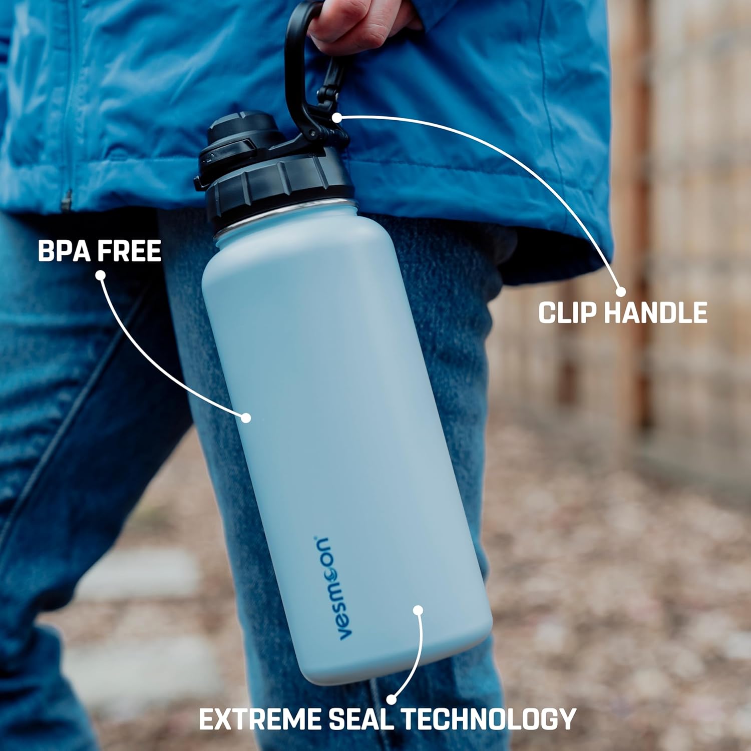 - PREMIUM INSULATED WATER BOTTLE - Vesmoon Vessence are manufactured from high quality sustainable materials that offer great thermal insulation. Unlike conventional thermos water bottles, our triple walled design, keeps your drinks hot or cold for longer and up to 36+ hours it'll surprise you! Our stainless steel water bottle has a wide mouth making cleaning easier.
