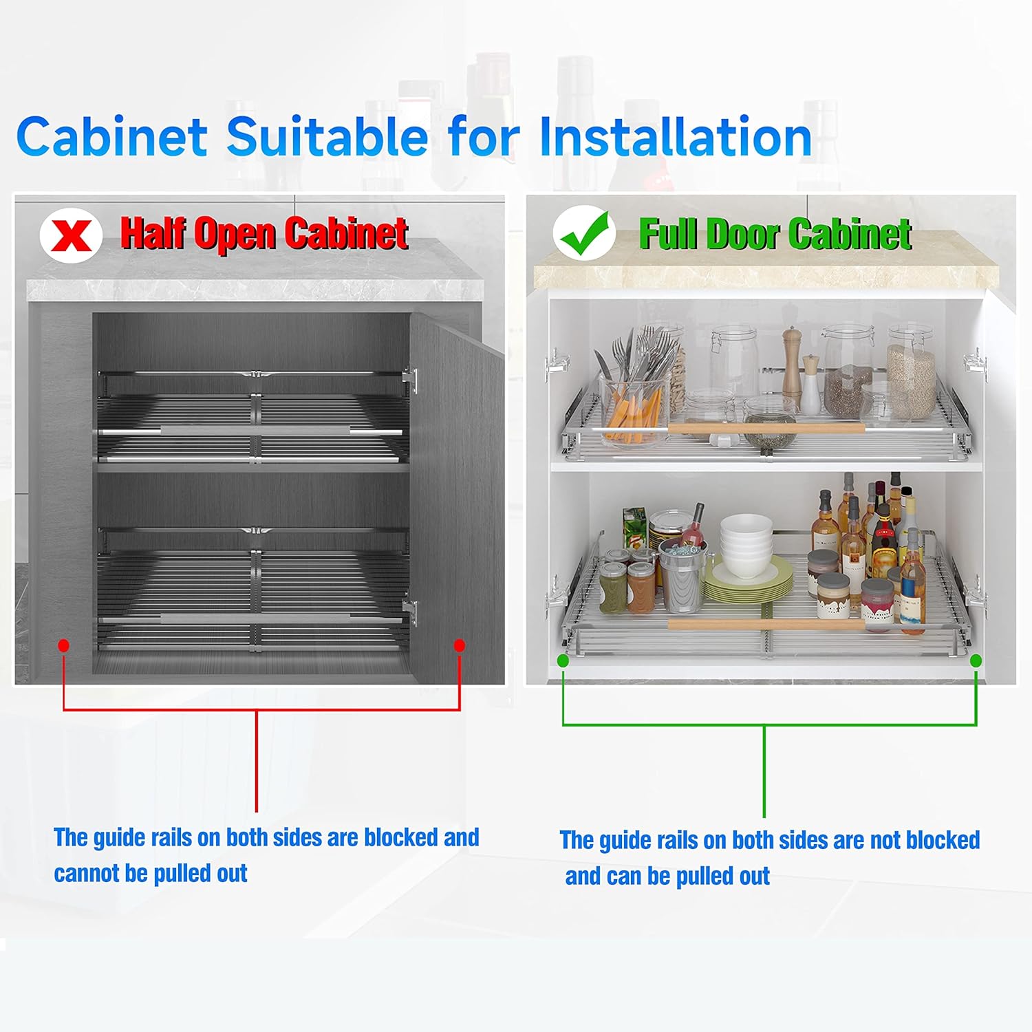 - Pull Out Drawers for Kitchen Cabinets with Adjustable Height: The improved slide out cabinet organizer is more flexible than the traditional pull out cabinet organizer. Its guide rail is installed on the side of the cabinet rather than the bottom of the cabinet. So it can be installed at any height. You can adjust the height of the installation basket according to your comfort. Note: Avoid the hinge of the cabinet during installation