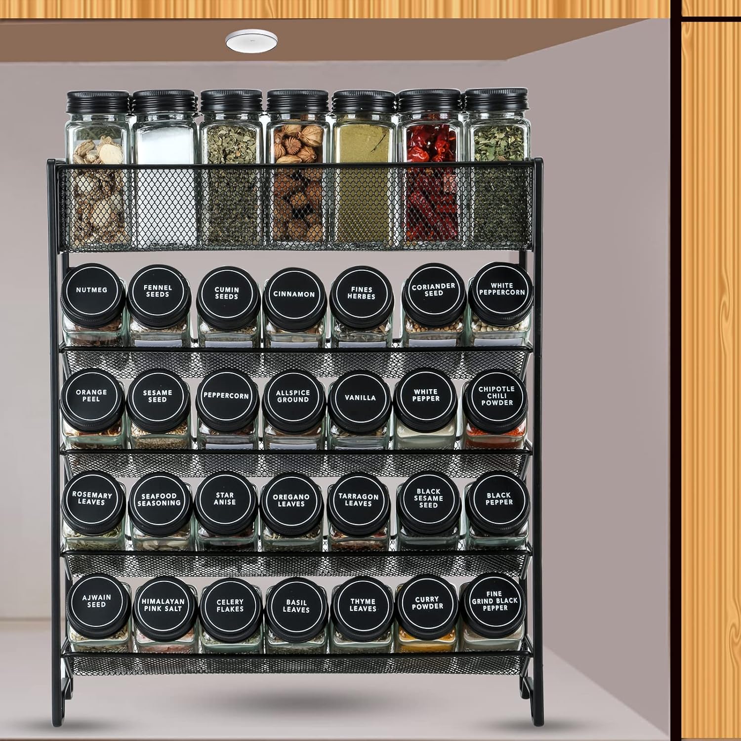 - 5 Tier Spice Rack - Made of strong steel and powder coatings electrostatic spray finished.Ideal sized spice rack organizer for cabinet, countertop, pantry, cupboard, door or wall mount. Inclined design make it easy to locate and quickly grab what you need, turn any mess of spice into an organized masterpiece .