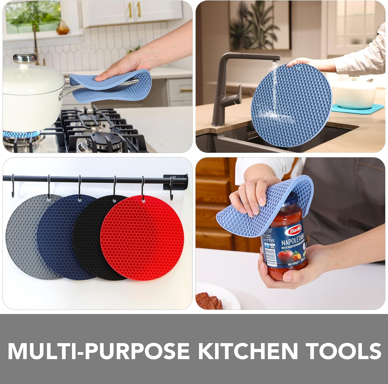 - MULTI-PURPOSE KITCHEN TOOLS - Each trivet has a corner hole for convenient hanging storage and can be used as a coaster, drying mat, jar opener gripper pad, spoon holder, garlic peeler, and potholder mat.
