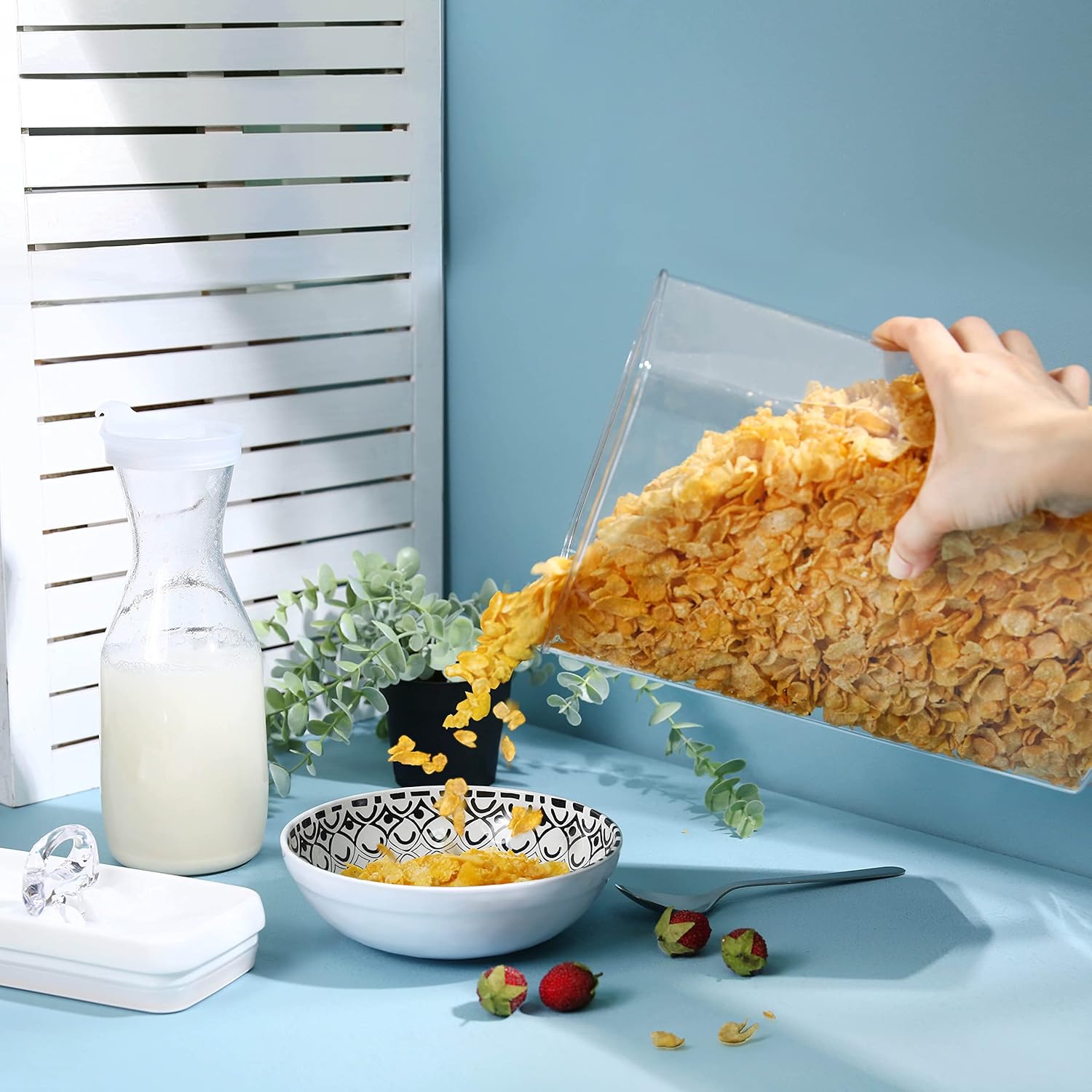 • 4 PK RECTANGULAR CONTAINER SET – BREAKFAST CEREAL SET: Set includes 1 x Rectangular–Tall (4.4qt), 1 x Rectangular-L (2.8qt), 2 x Regular-S (0.5qt) designed for optimal storage of cereal, granola, grains, oatmeal, dry fruit, chocolate chips, pasta, and nuts. Versatile enough for bathroom essentials like Q-tips and makeup, office supplies, and general home organization. A must-have for keeping your pantry and space neatly arranged!