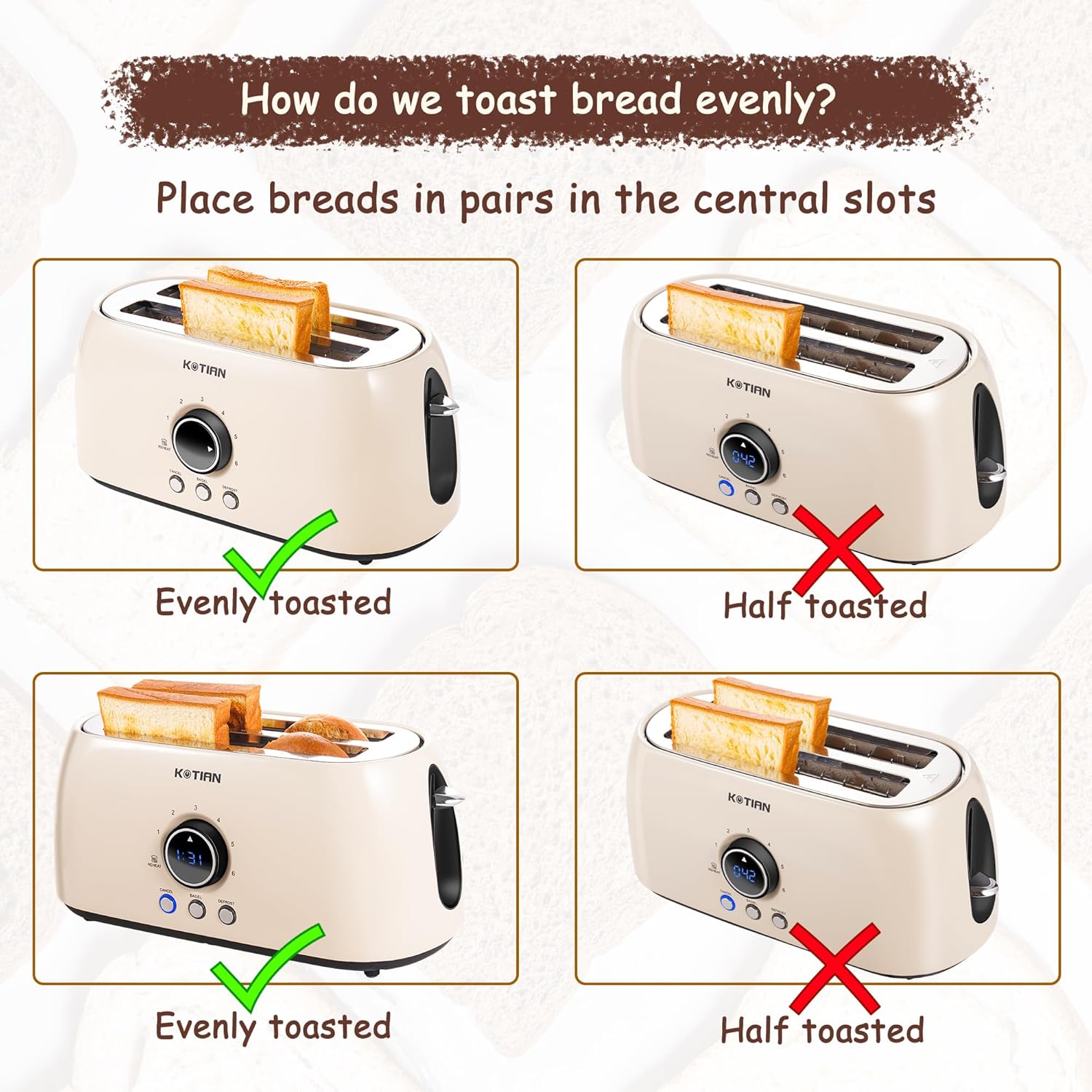 - Make More Toasts: With this long slot toaster, you can bake 4 slices of toast at a time, or longer 2 slices of bread, such as sandwich bread, handmade bread, rectangular toast, etc. And one 4 slice compact toaster saves more space in the kitchen