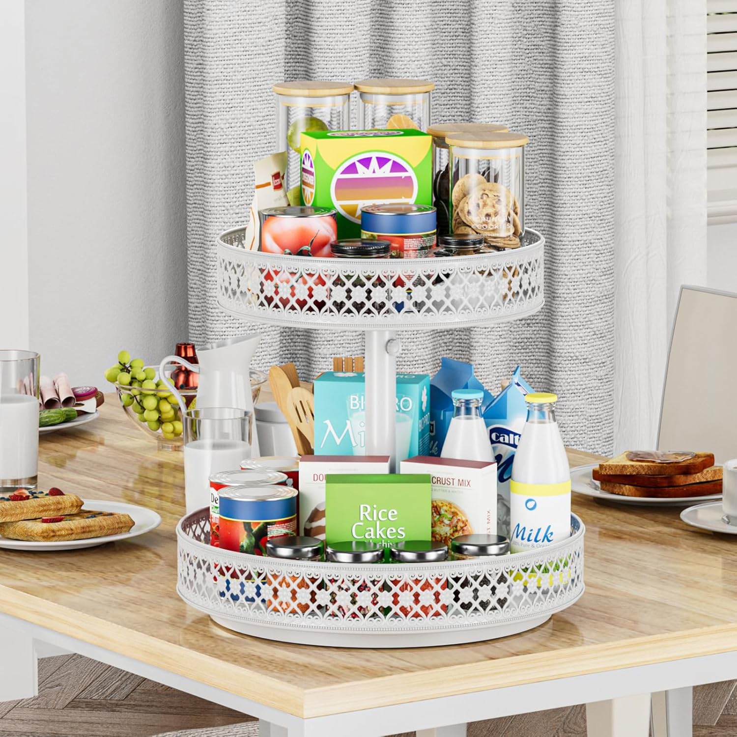 Lazy Susan Organizer 2 Tier - Turntable Spice Rack 12 inch Adjustable Metal Rotating Lazy Susan for Cabinet Pantry Kitchen Countertop Dining Table Cupboard Bathroom Vanity Storage White