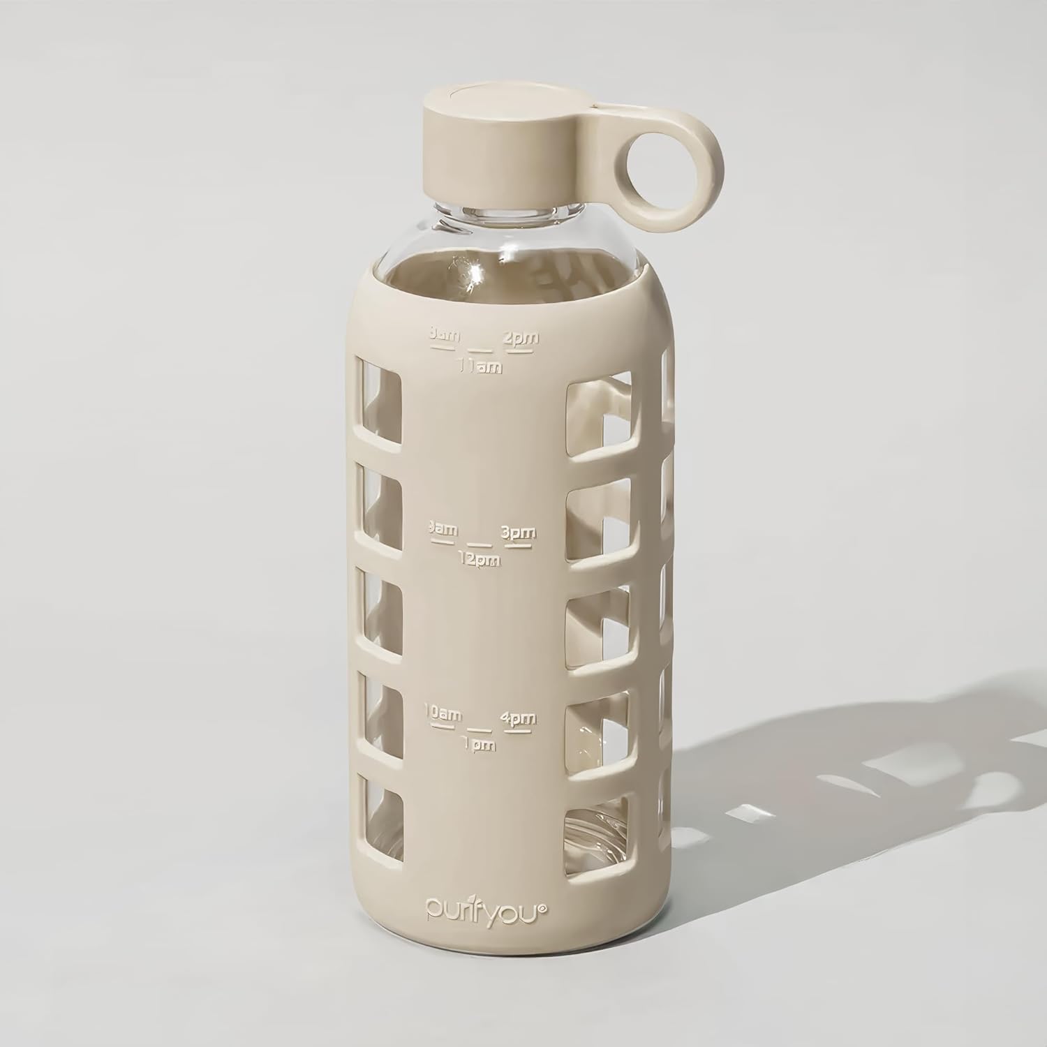 purifyou 40oz / 32oz / 22oz / 12oz Borosilicate Glass Water Bottle with Time & Volume Markers, Silicone Sleeve, Stainless Steel Lid – Reusable Glass Bottle for Water & Juice (22oz Pearled Ivory)