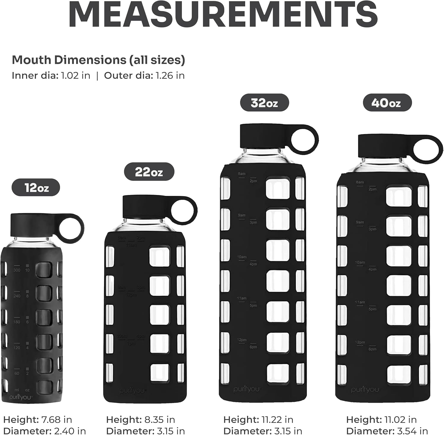 purifyou 40/32 / 22/12 oz Glass Water Bottles with Volume & Times to Drink, Extra Thick Silicone Sleeve, Reusable Bottle for Fridge Water, Milk, Juice (32oz Jet Black)