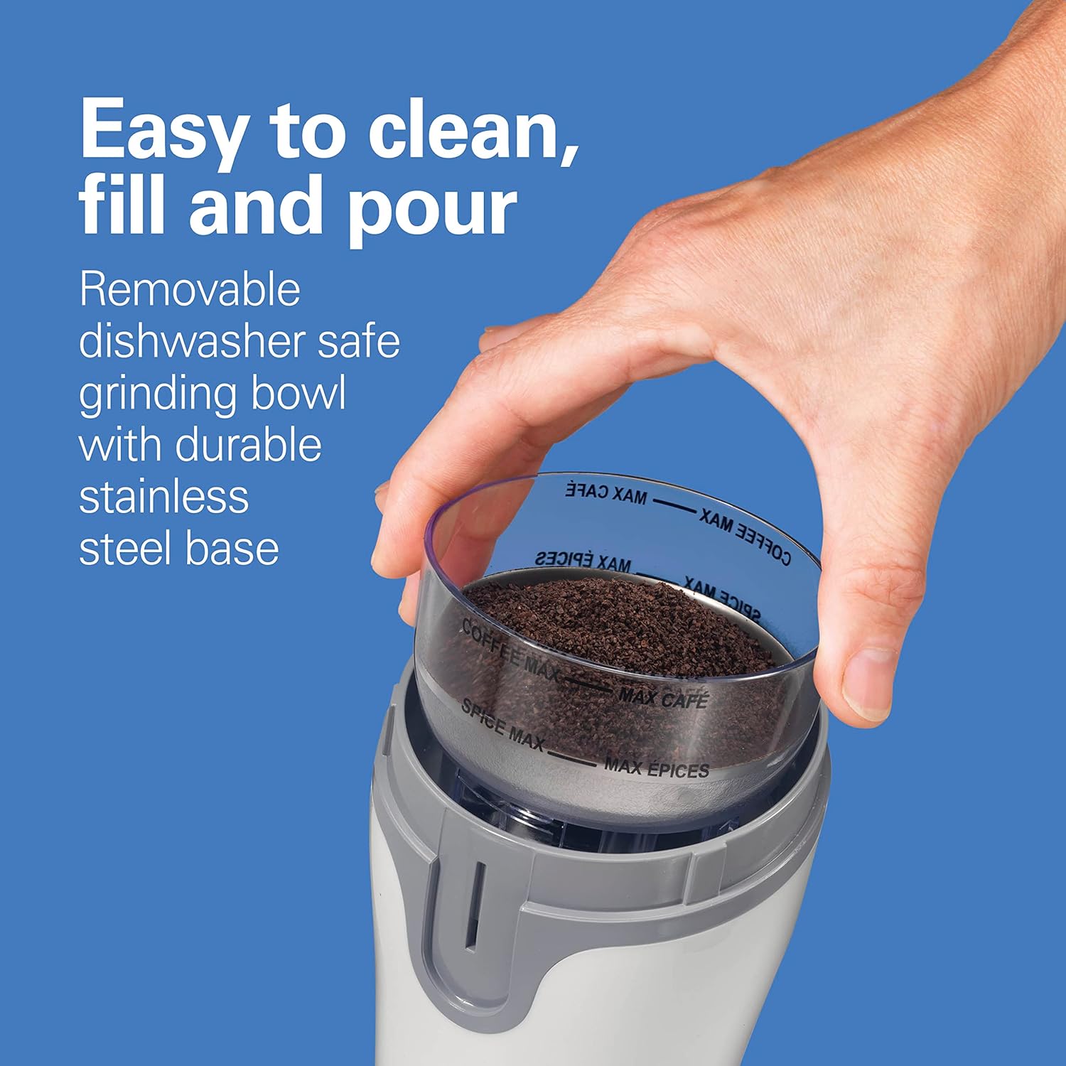 - EASY CLEANUP — DISHWASHER SAFE GRINDING BOWL: The grinding bowl on this coffee bean grinder is designed with a durable stainless steel base. The bowl is removable for easy filling and pouring and is dishwasher safe.