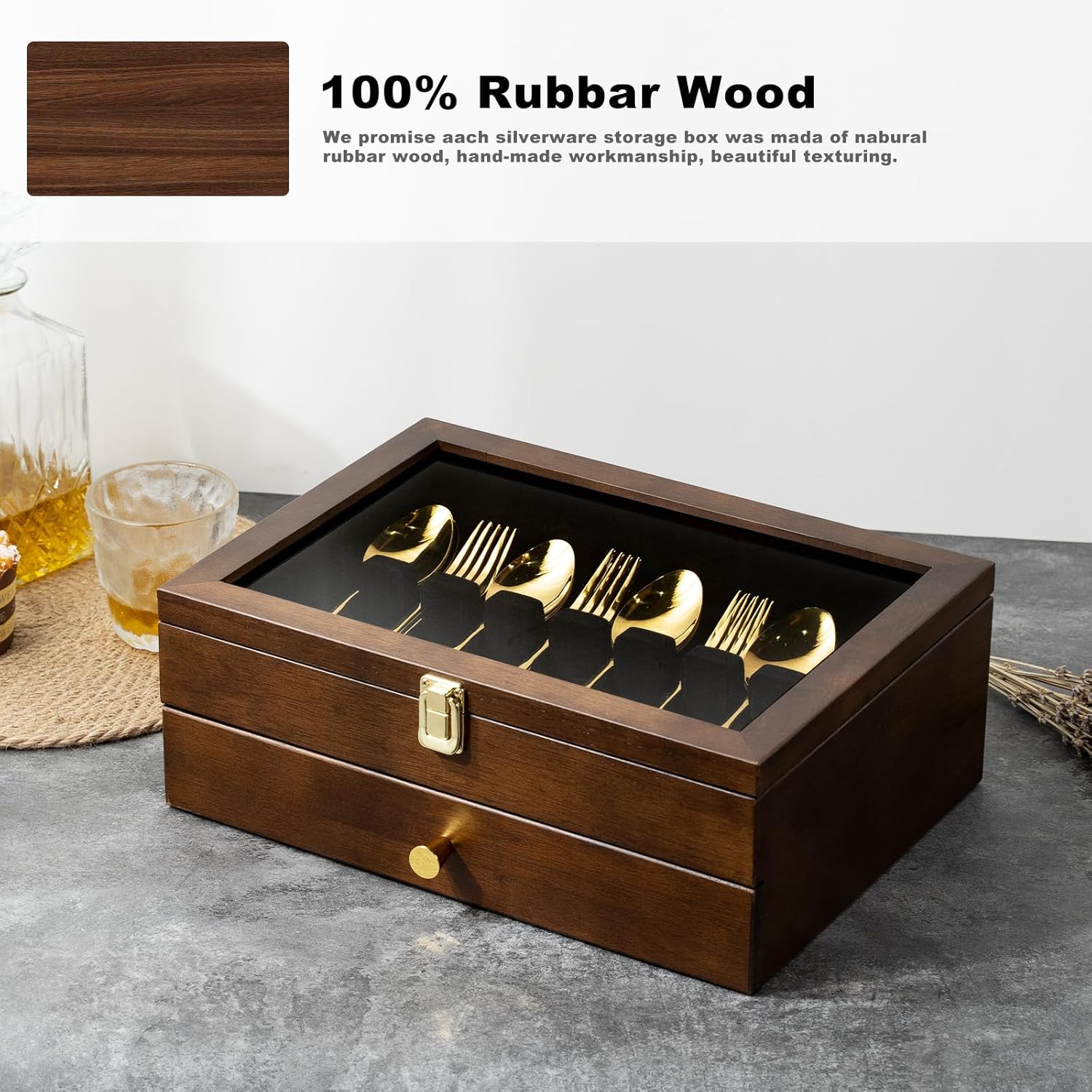 Silverware Box, 2-Layer Wooden Silverware Storage Box with Glass Lid, 14.5×10.6 Inches Luxury Style Decor Flatware Storage Case for Fine Flatware & Utensils, Gift Idea (Walnut)