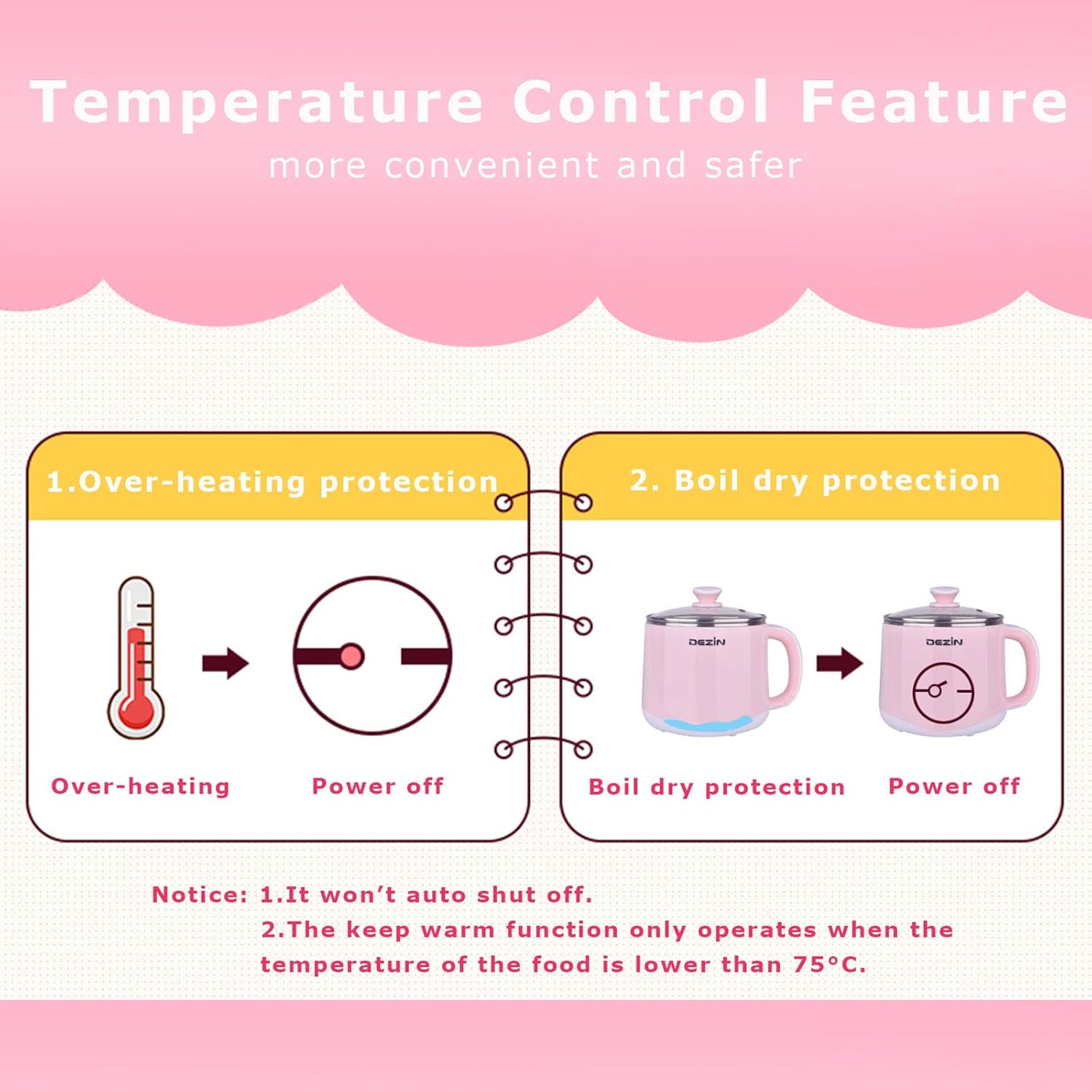- We take care of your safety - Equipped with keep warm function (this function will work repeatedly to stabilize the temperature between 75 °C to 80 °C, which means only if the temperature is lower than 75°C, it will operate, and when the temperature is higher than 80°C again, the function will turn off itself), over-heating protection and boil dry protection. Including 100% stainless steel interior and stain-resistant glass cover, with double wall construction, more convenient and safer.