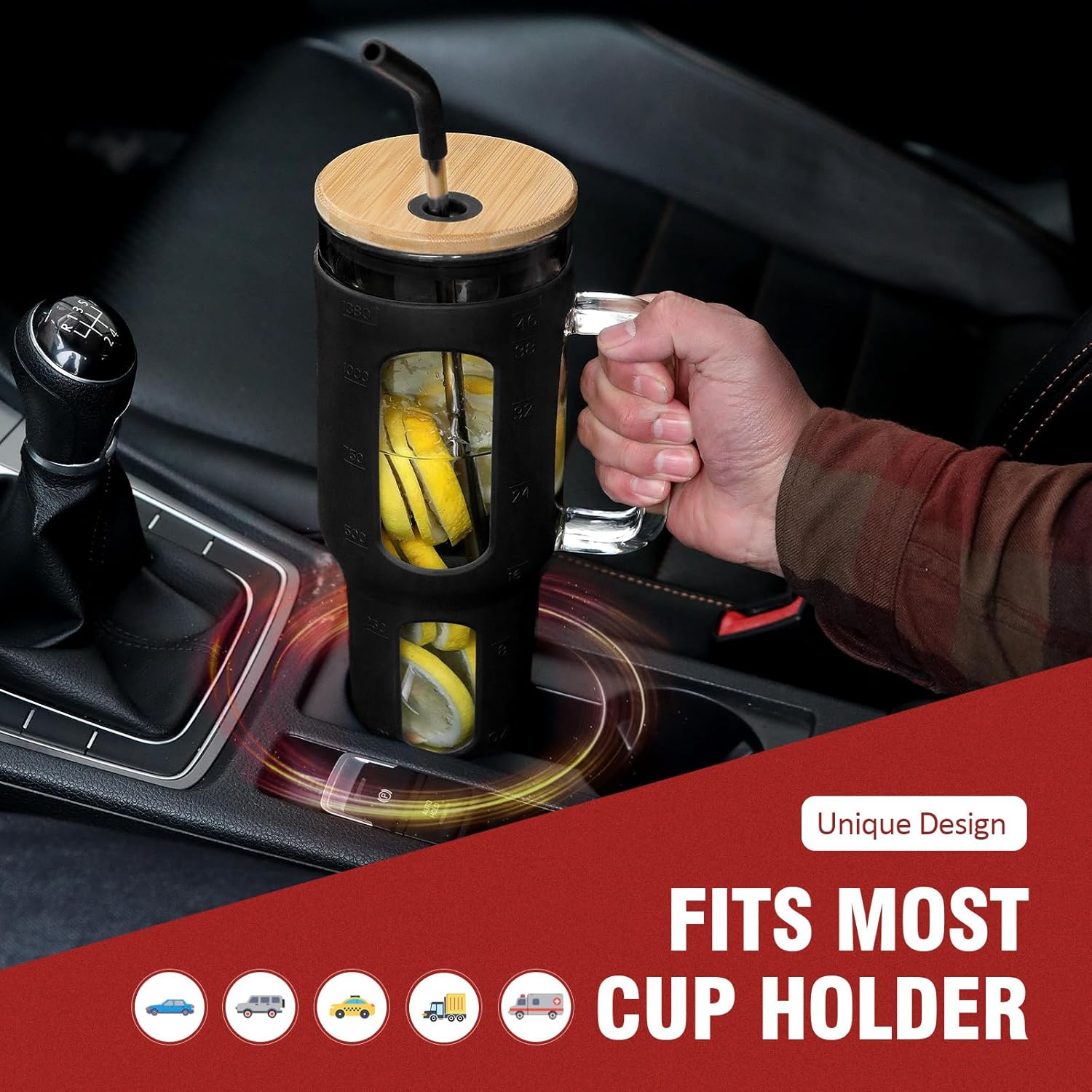 - DEVELOPED FOR CAR CUP HOLDERS-Glass cups with lids and straws specially designed for car cup holders. Perfectly sized designed to hold 46oz of hot tea and iced coffee. The smoothie cup can be safely placed in most car cup holders.