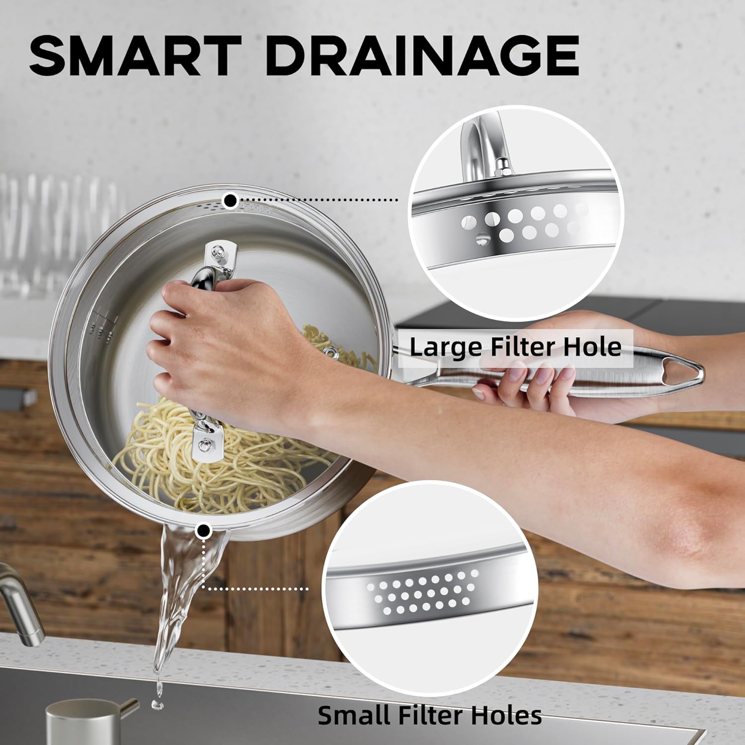Leetaltree 2.5 Quart Stainless Steel Saucepan with Glass Strainer Lid, Thicken Tri-ply Ful Body, Multipurpose Sauce Pot with Two-Size Drainage Holes Lid, Perfect For Boiling Gravies, Pasta, Noodles