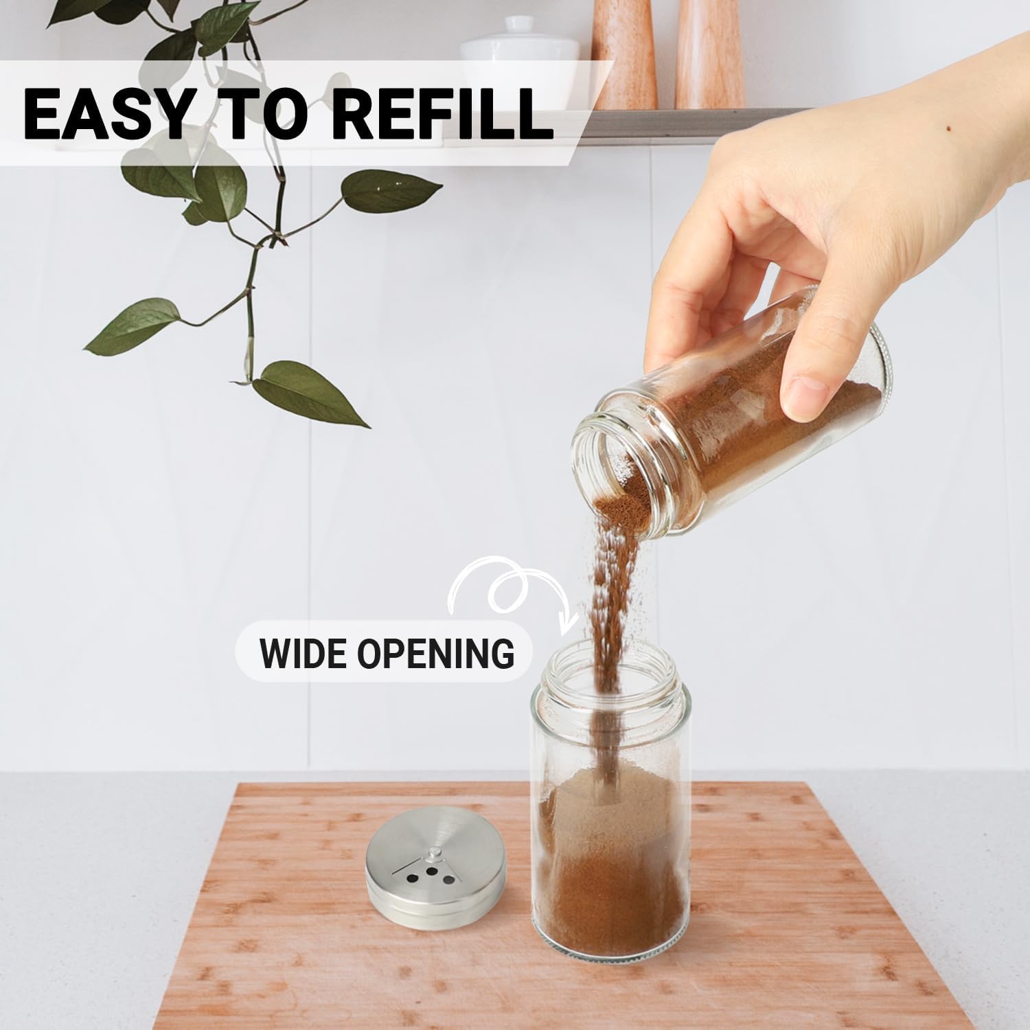 - Sturdy Glass Spice Containers: Our seasoning containers are crafted from high-quality thickened glass, ensuring their durability and sturdiness. Seasoning shakers protects the spices from light, moisture and air, keeping them fresh and flavourful for longer. The transparency of the glass spices jar ensures that you can clearly see the spices in the bottle, so that you can refill it in time.