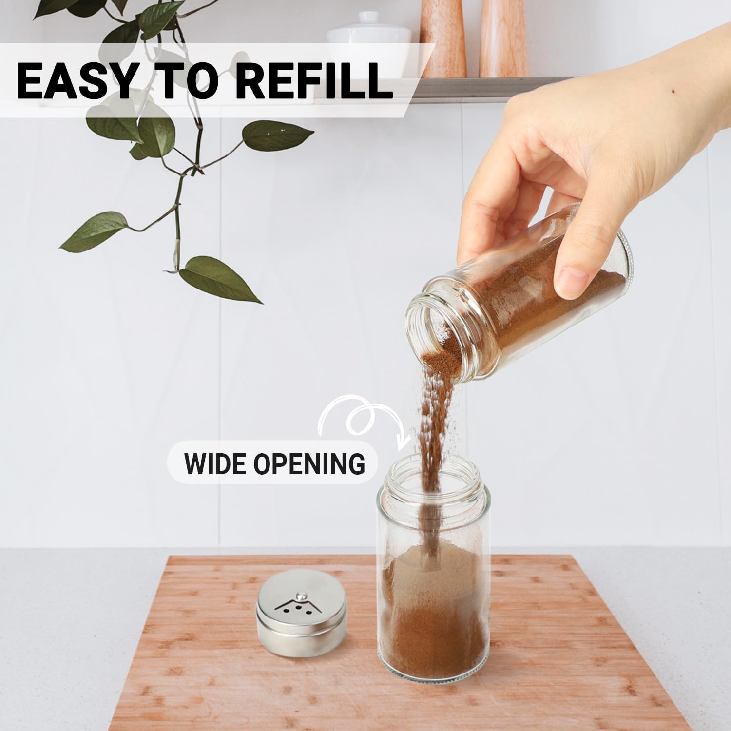 - Sturdy Glass Spice Containers: Our seasoning containers are crafted from high-quality thickened glass, ensuring their durability and sturdiness. Seasoning shakers protects the spices from light, moisture and air, keeping them fresh and flavourful for longer. The transparency of the glass spices jar ensures that you can clearly see the spices in the bottle, so that you can refill it in time.