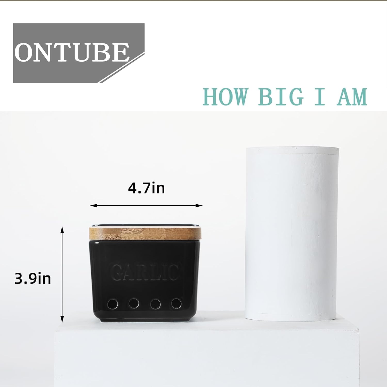 ONTUBE Garlic Keeper with Lid, Ceramic Garlic Holder Storage, Garlic Container for Kitchen, Garlic Saver to Keep Your Garlic Cloves Fresh Longer 4.7-Inch, Black