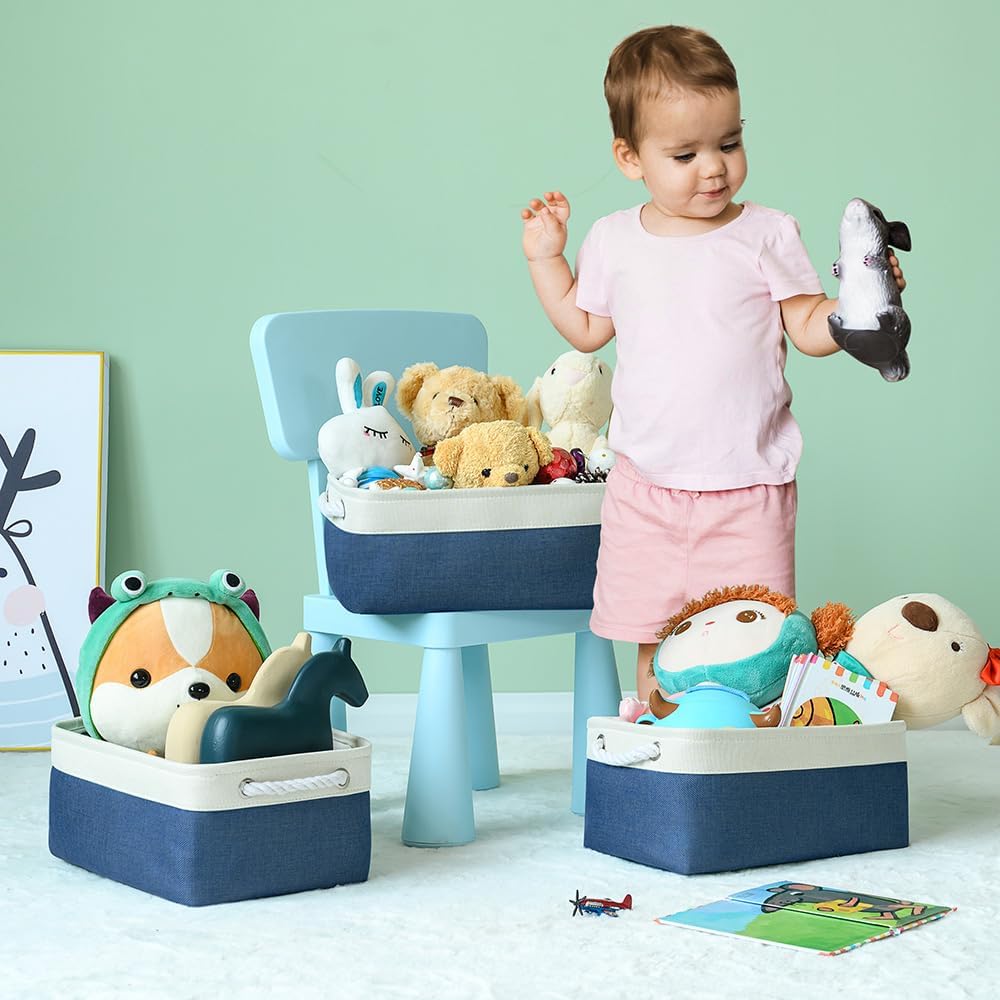 TheWarmHome Storage Basket for Organizing - Medium 3 Pack 14x10x7 inch Fabric Storage Cubes for Shelves with Rope, Collapsible Storage Bin for Organizer Closet Cloth Gift Toy (White & Jean Blue)