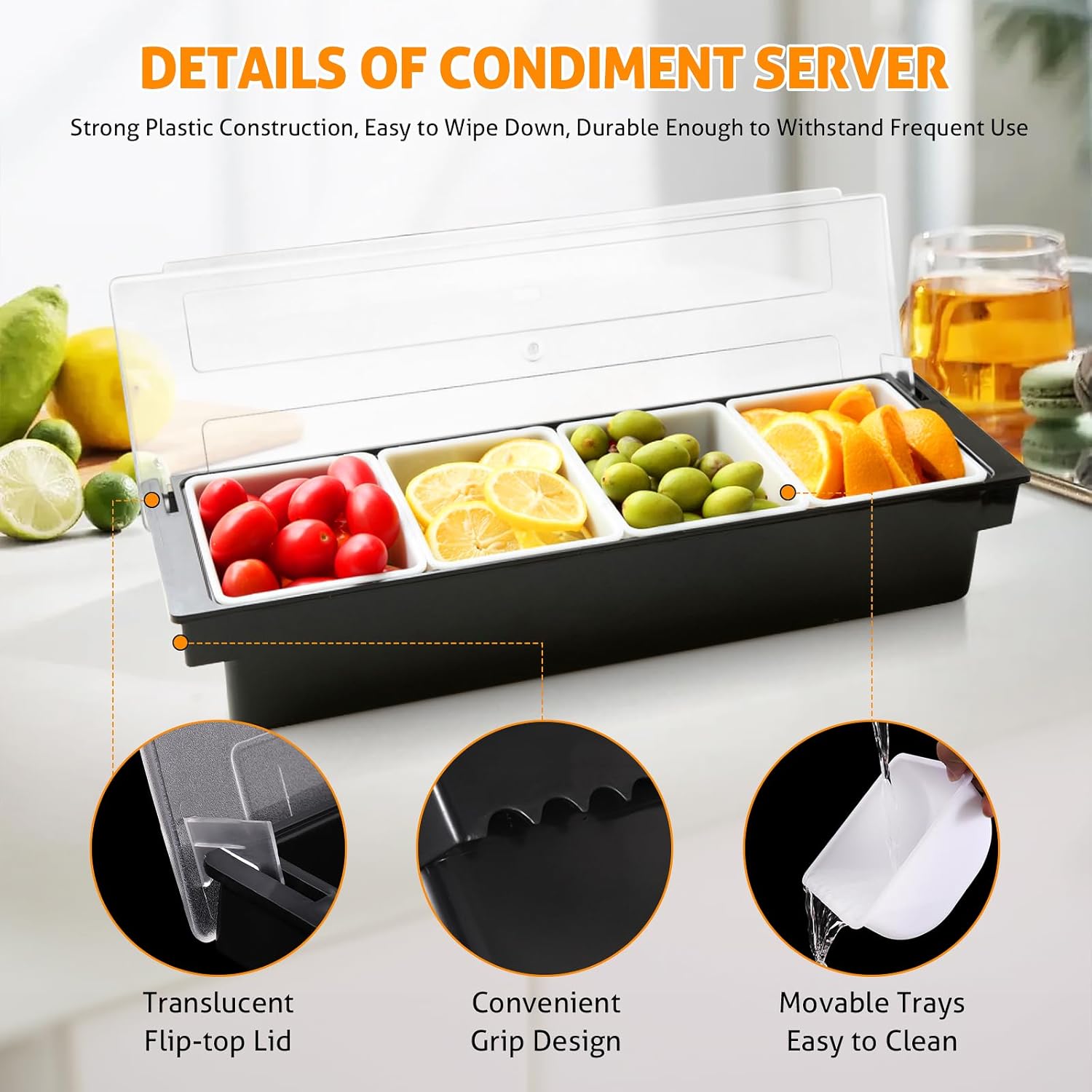- ORGANIZE CONDIMENTS & GARNISHES - Our portable caddy has multi trays that have enough space to hold party food items, such as olives, pickles, fruit slices, nuts, seeds, gray, sauces and salad dips.