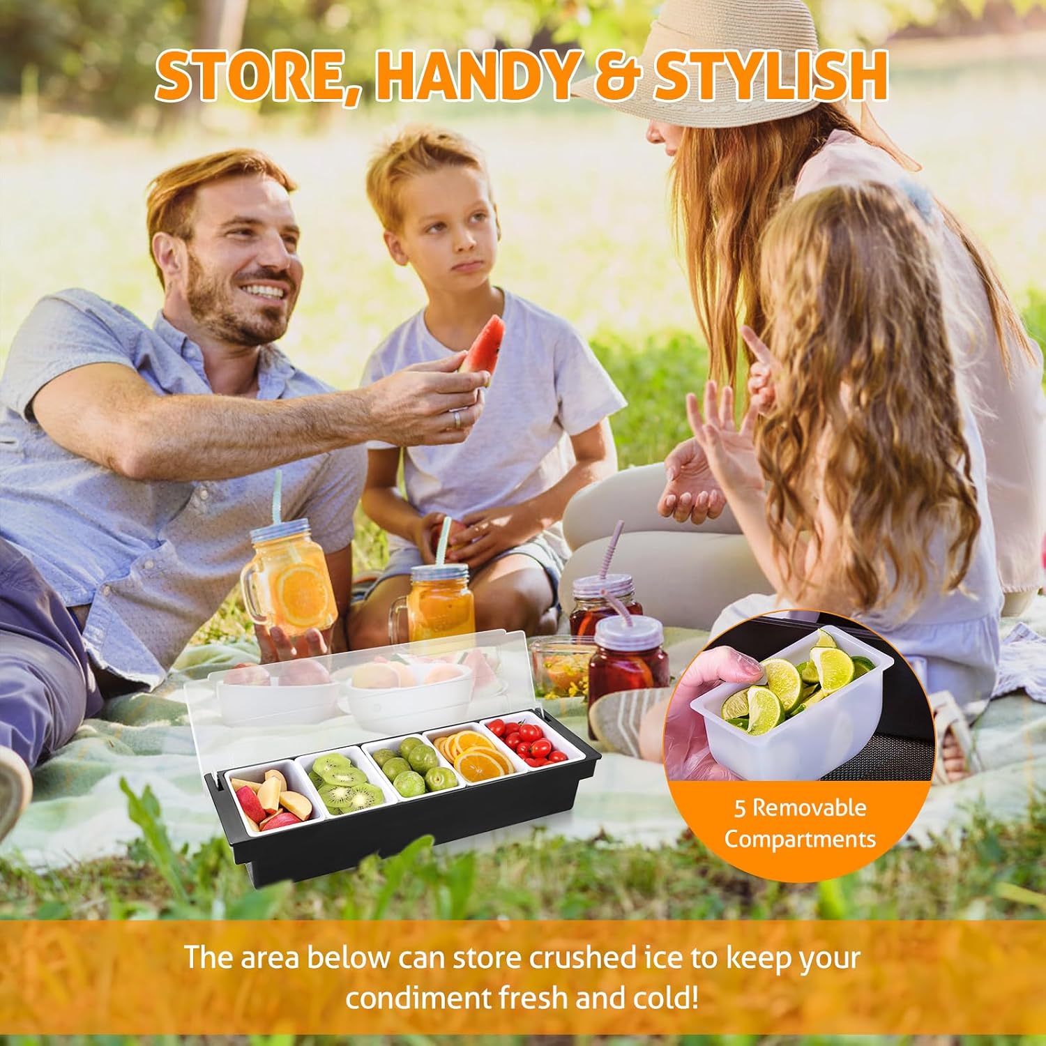 WICHEMI Fruit, Veggie & Condiment Caddy with Lid Dispenser Tray Garnish Station for Bartending & Serving Taco, Ice Cream, Salad Bar - Topping Organizer for Restaurant Supplies (5 Compartment, 2 Pack)